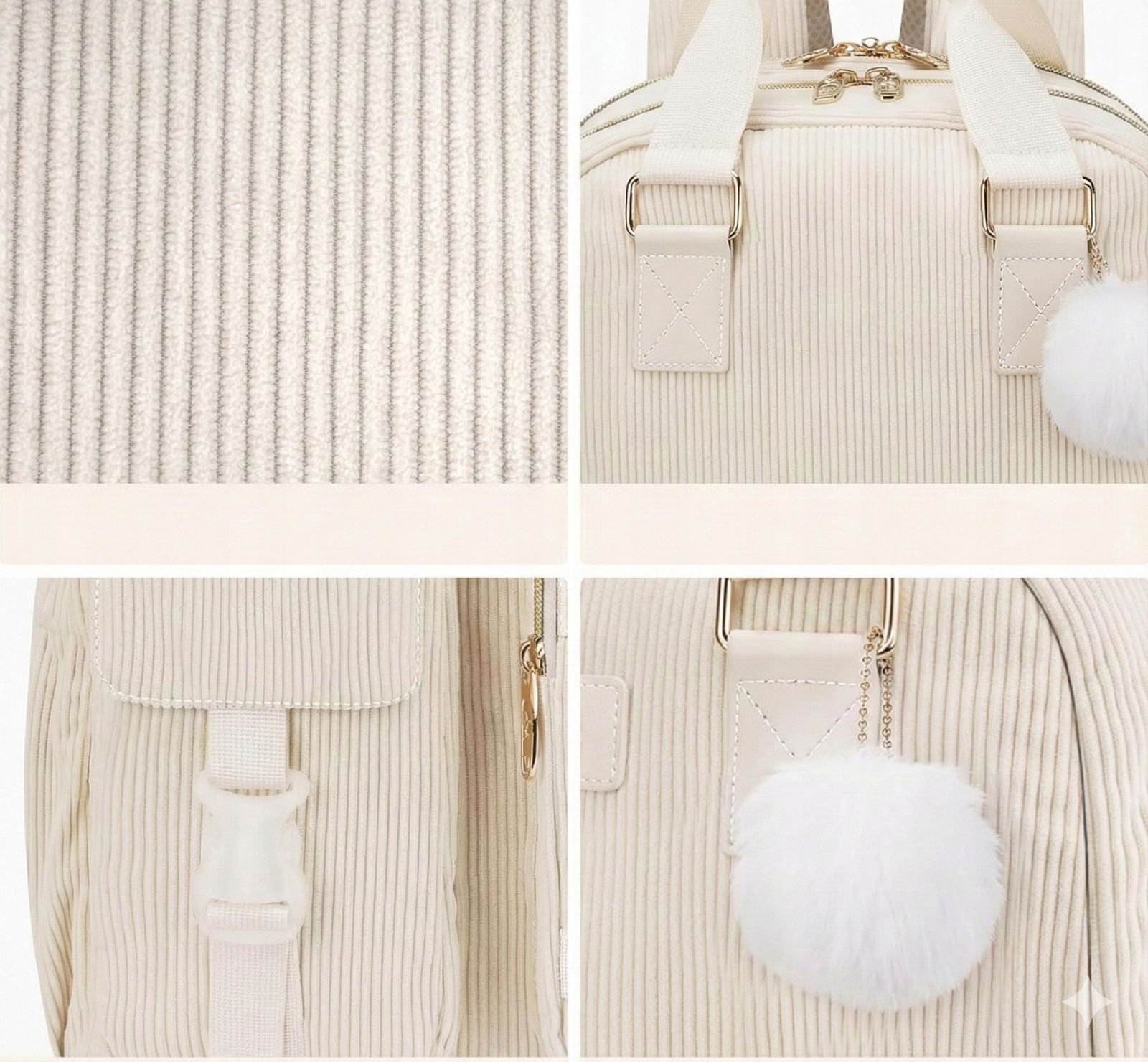 1. Stylowy Materiał i Wykończenie Plecak wykonany jest z wysokiej jakości tkaniny sztruksowej (corduroy), która nadaje mu unikalny, ciepły i modny wygląd. Całość dopełniają eleganckie wstawki z ekoskóry oraz uroczy, odpinany pompon, który dodaje całości lekkości i kobiecego charakteru.