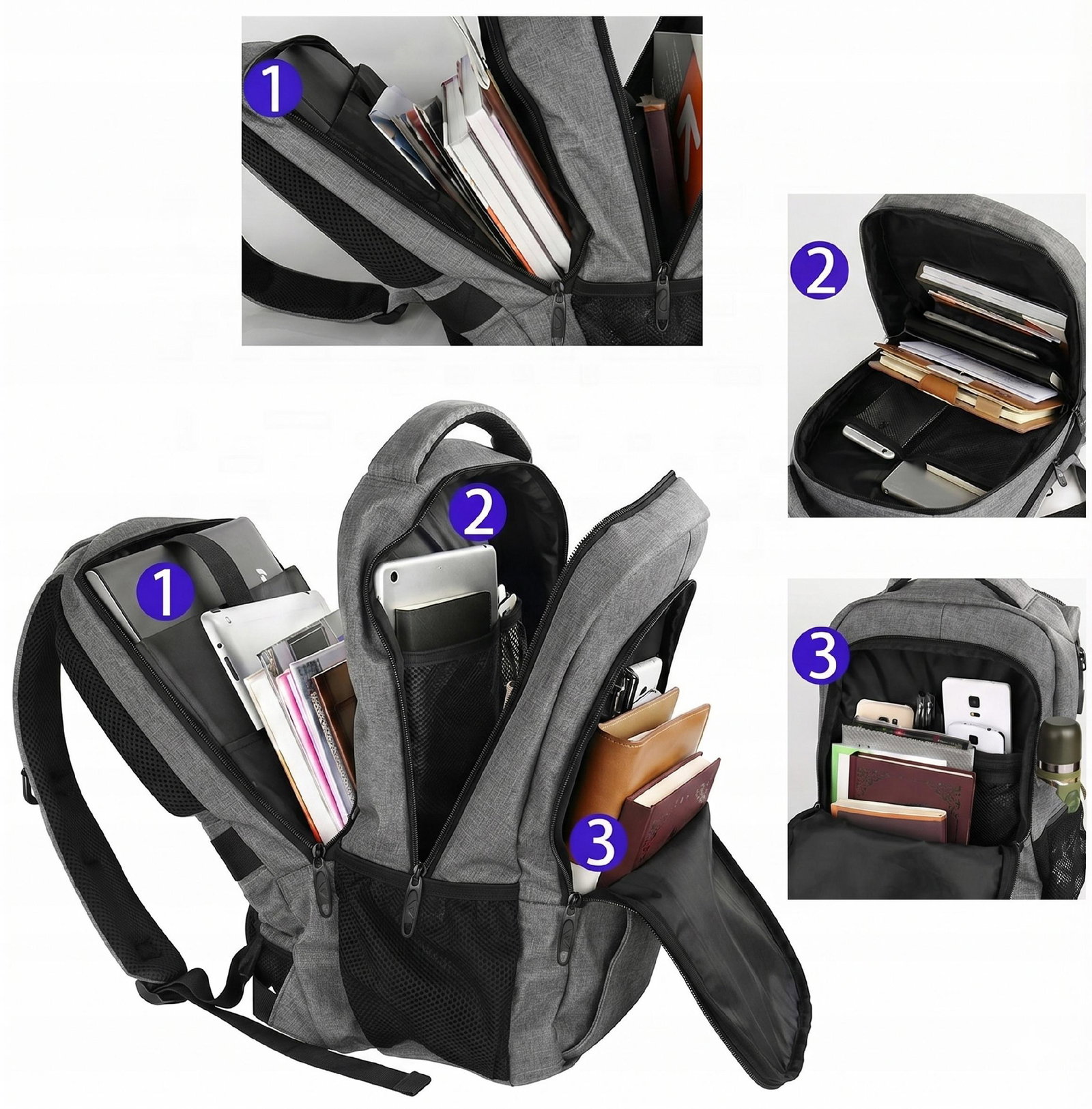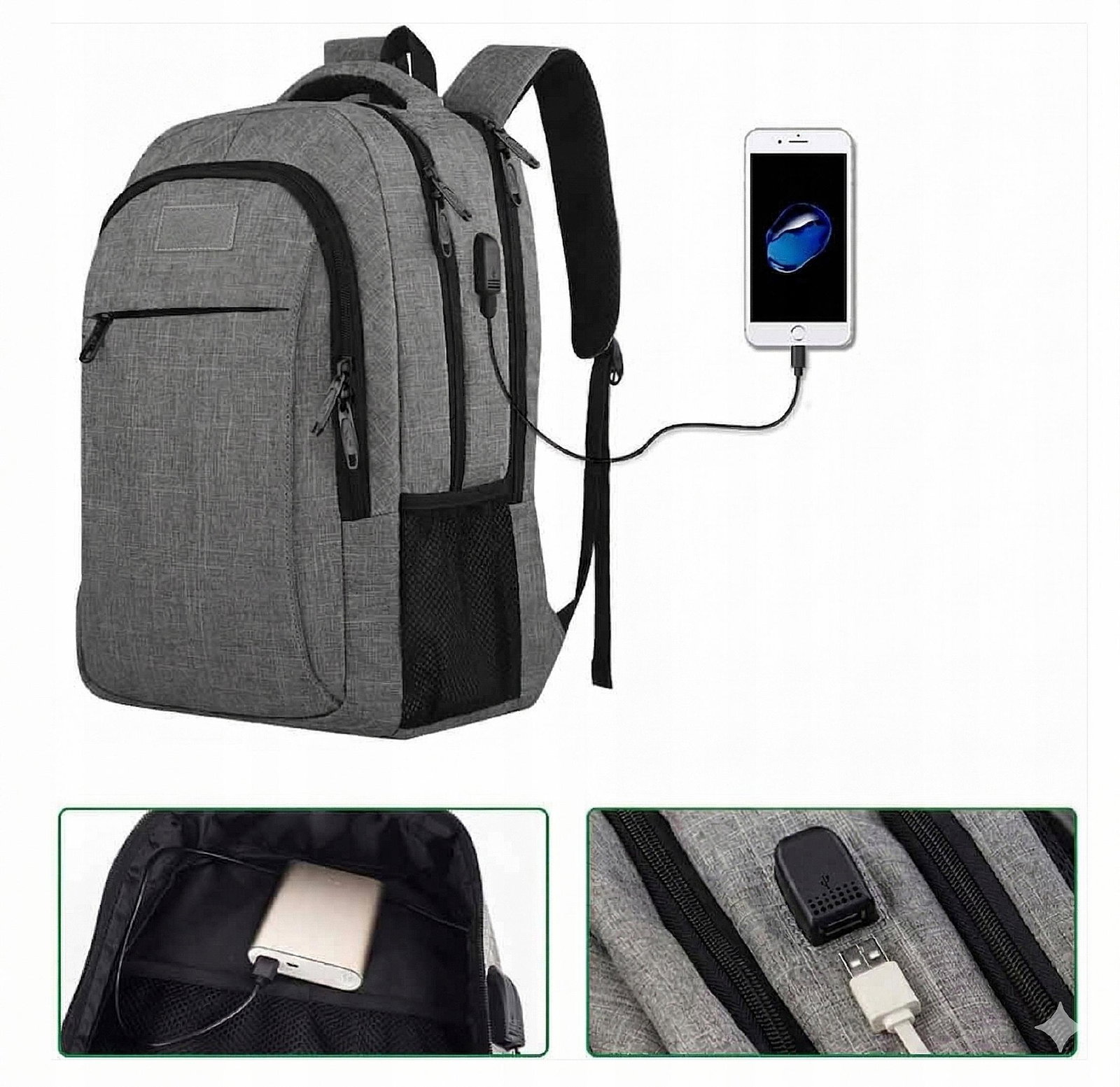 - Port USB: Podłącz powerbank wewnątrz (np. w komorze głównej) i ładuj telefon na zewnątrz, korzystając z wbudowanego gniazda.