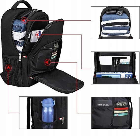 - Organizacja przestrzeni: konstrukcja plecaka oferuje ponad 10 kieszeni i przegród, które ułatwiają organizację codziennych akcesoriów. Główna komora umożliwia przechowywanie ubrań lub książek, a przednia kieszeń z dodatkowymi przegrodami pozwala uporządkować drobne przedmioty takie jak telefon, dokumenty czy portfel. Boczne kieszenie z elastycznej siatki umożliwiają wygodne przenoszenie butelki z wodą lub parasola.