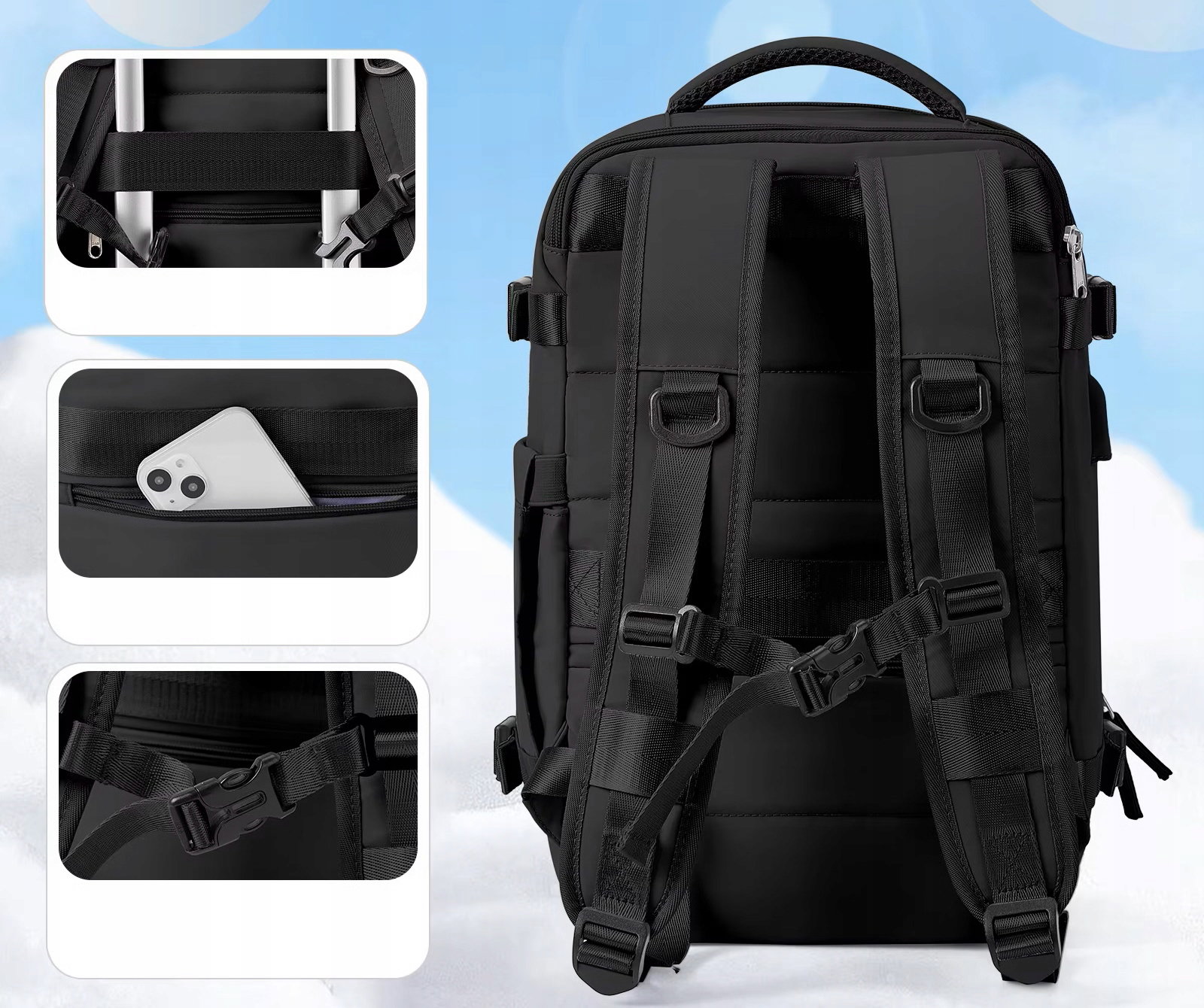 ✅Plecak zawiera specjalny pas, który umożliwia łatwe umocowanie na uchwycie walizki podróżnej. Ułatwisz sobie w ten sposób podróżowanie!
