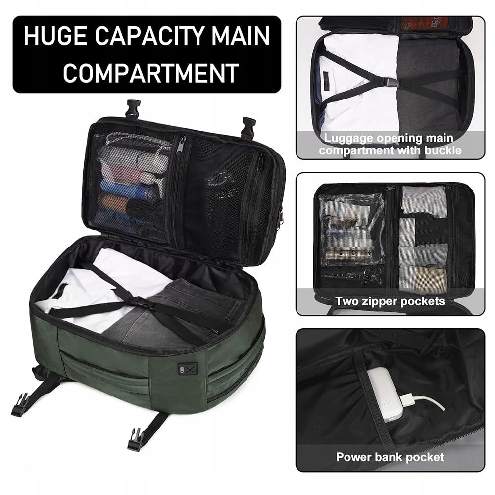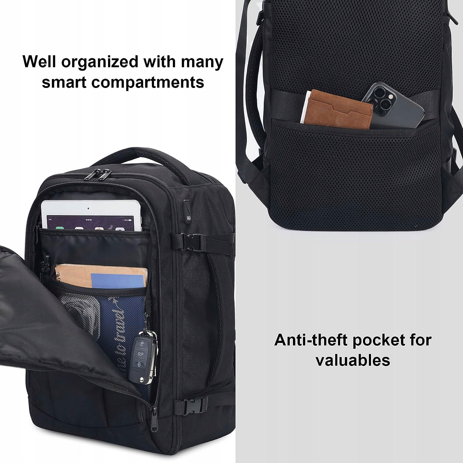 Torba posiada 3 przegrody i 10 kieszeni, dzięki czemu łatwo uporządkujesz swoje rzeczy. Główna komora otwiera się jak walizka, a siatkowe kieszenie idealnie nadają się na bieliznę i przybory toaletowe. W górnej komorze przechowasz telefon, paszport i inne drobne przedmioty, a z tyłu plecaka znajdziesz kieszeń na zamek do przechowywania kosztowności.