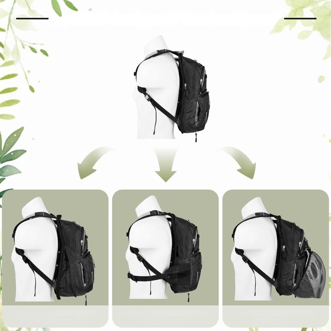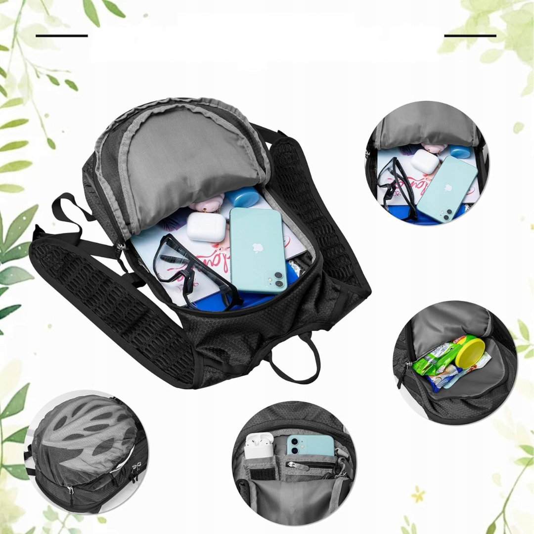 - Zastosowanie: plecak outdoorowy przeznaczony do przechowywania niezbędnych przedmiotów podczas aktywności na świeżym powietrzu, takich jak jazda na rowerze, wspinaczka, wędrówki czy bieganie. Dzięki licznym przegródkom i funkcjom, takim jak kieszeń na bukłak czy rozkładana kieszeń na kask, umożliwia wygodne i bezpieczne transportowanie sprzętu. Wodoszczelny materiał zapewnia ochronę zawartości plecaka przed lekkim deszczem, a regulowane paski i odblaskowe elementy zwiększają komfort noszenia i widoczność użytkownika.