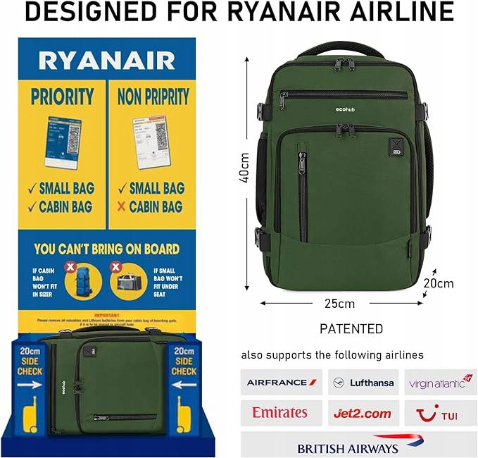 - Torba pod siedzeniem ma wymiary 40x20x25 cm i pojemność 20L, a jej waga wynosi 570g. Ryanair,nadaje się również do Easyjet, British Airways, Etihad, Emirates i innych linii lotniczych.