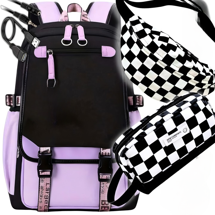 ✅ Kompletny zestaw 7w1 – plecak, piórnik, nerka, kabel USB, kabel jack, port USB.