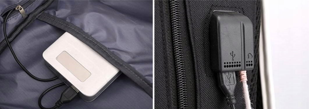 ✅ Wkładasz powerbank do plecaka i podłączasz go do kabla – ładowanie z zewnątrz.