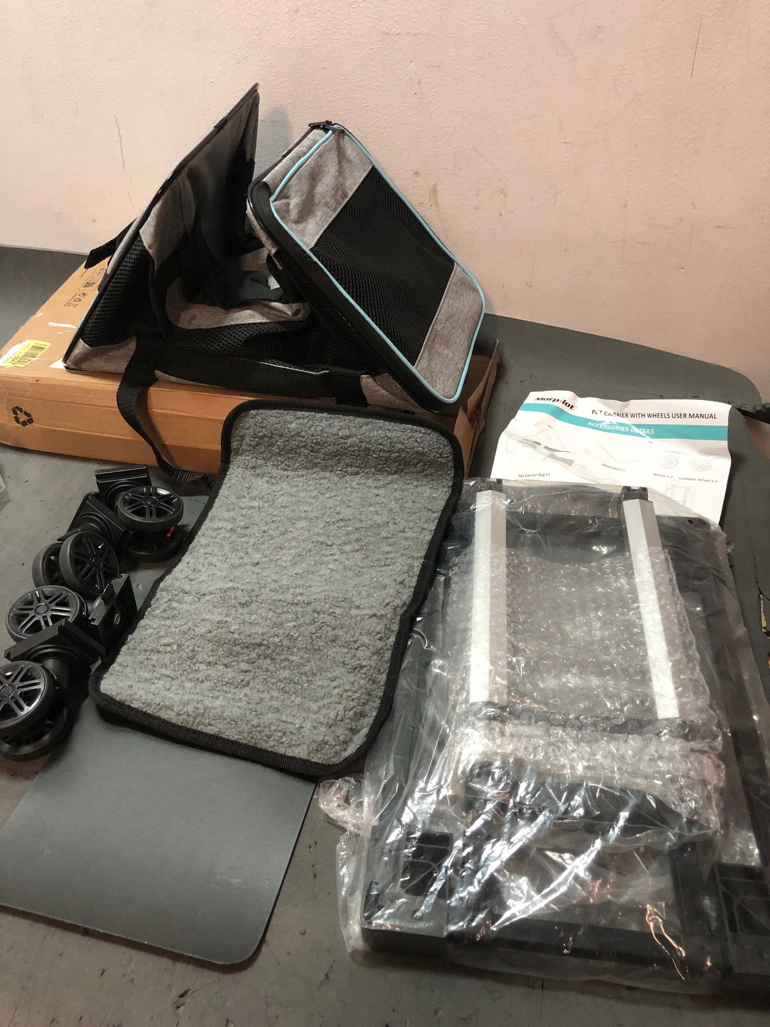 - zawarte komponenty: transporter dla kotów, Pasek na ramię, Wózek na kółkach, koła