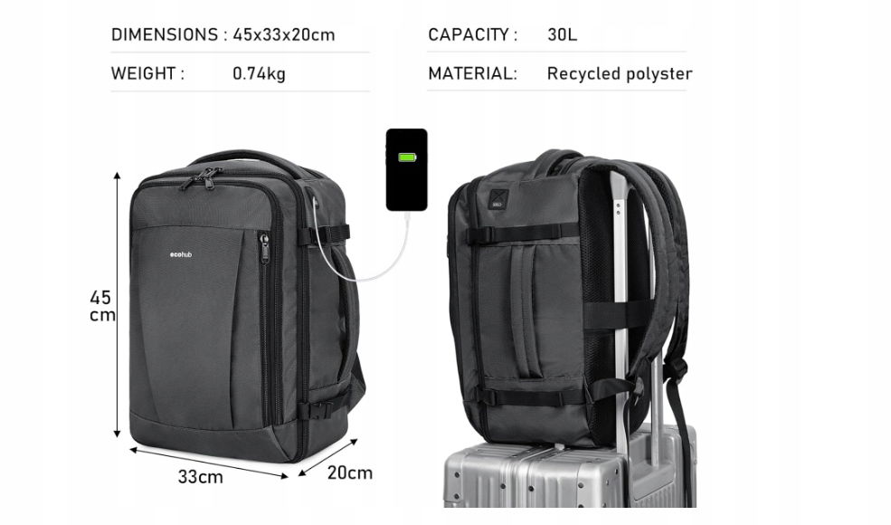 Przyjazny w podróży: plecak walizka ECOHUB waży zaledwie 0,74 kg. Przednie i boczne uchwyty do wszechstronnego przenoszenia. Otwór na kabel umożliwia łatwe ładowanie w podróży. Wyściełane plecy i paski na ramiona zapewniają wygodę i oddychalność. Wodoodporna i odporna na rozdarcia tkanina składa się z 34 przetworzonych plastikowych butelek PET i posiada certyfikat GRS.