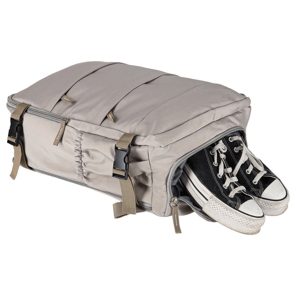 PASY KOMPRESYJNE I OSZCZĘDNOŚĆ MIEJSCA - Dzięki zapinanym pasom kompresyjnym można zmniejszyć objętość plecaka i dopasować go do zawartości bagażu. To praktyczne rozwiązanie podczas podróży samochodem lub transportem publicznym, gdy liczy się kompaktowy rozmiar i wygodne przechowywanie bagażu.