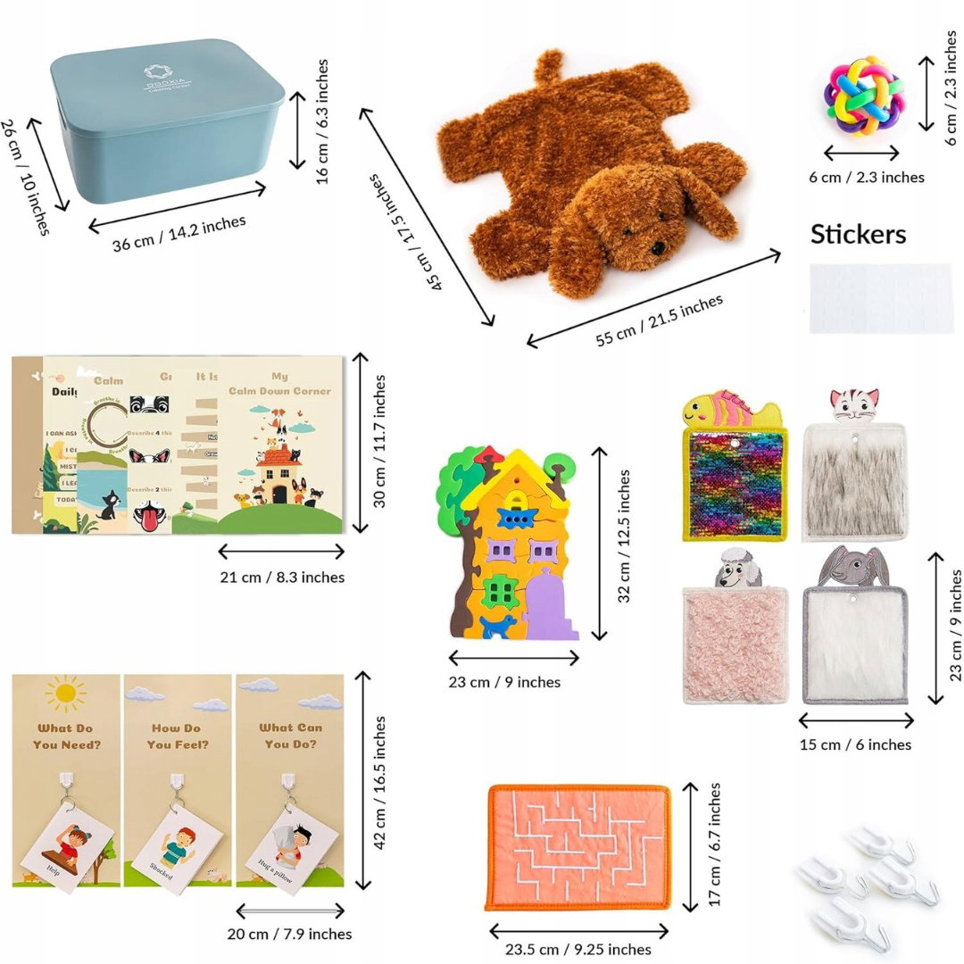 - Redukcja napięcia i poprawa koncentracji: zestaw zawiera plakaty edukacyjne (j. angielski), zabawki sensoryczne oraz narzędzia do relaksacji, które zapewniają bodźce dotykowe, fizyczne odprężenie i wyciszenie umysłu. Pomaga dzieciom stworzyć spokojne i bezpieczne środowisko, sprzyjające skupieniu i lepszemu samopoczuciu.