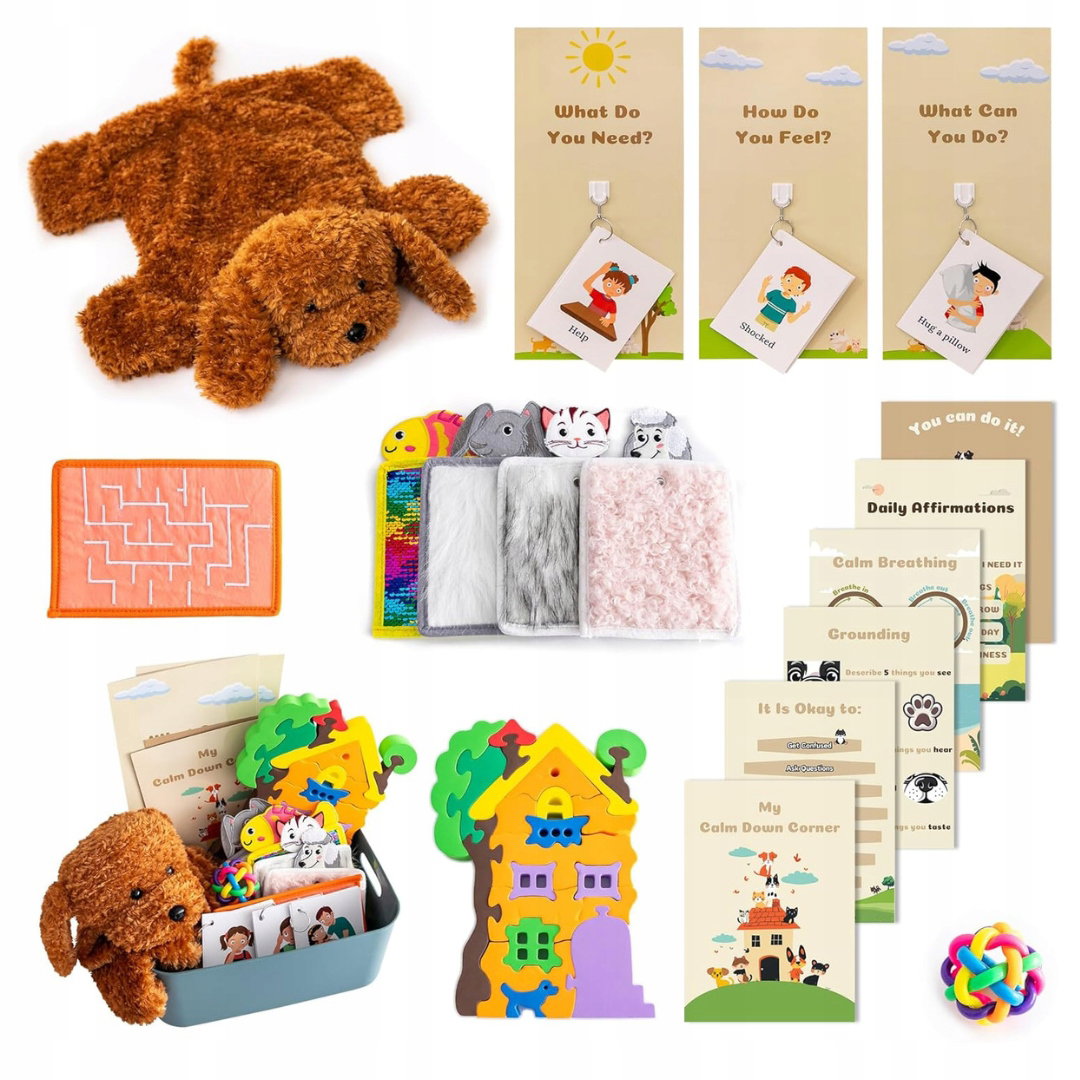 - Redukcja napięcia i poprawa koncentracji: zestaw zawiera plakaty edukacyjne (j. angielski), zabawki sensoryczne oraz narzędzia do relaksacji, które zapewniają bodźce dotykowe, fizyczne odprężenie i wyciszenie umysłu. Pomaga dzieciom stworzyć spokojne i bezpieczne środowisko, sprzyjające skupieniu i lepszemu samopoczuciu.