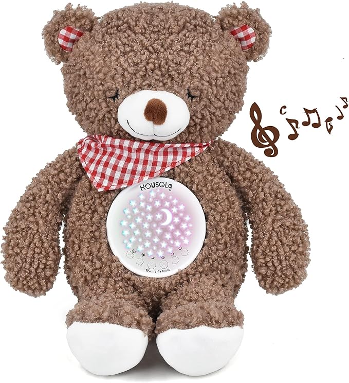 - 18 dźwięków i automatyczny wyłącznik: lampka nocna dla niemowląt Sleep Aid Teddy emituje 18 kojących dźwięków, w tym 13 kołysanek, 3 dźwięki neutralne, bicie serca i cichy dźwięk brzegu. Pozytywka z funkcją timera – dźwięk i/lub światło można automatycznie wyłączyć po 15, 30 lub 60 minutach, aby zapobiec obudzeniu dziecka.