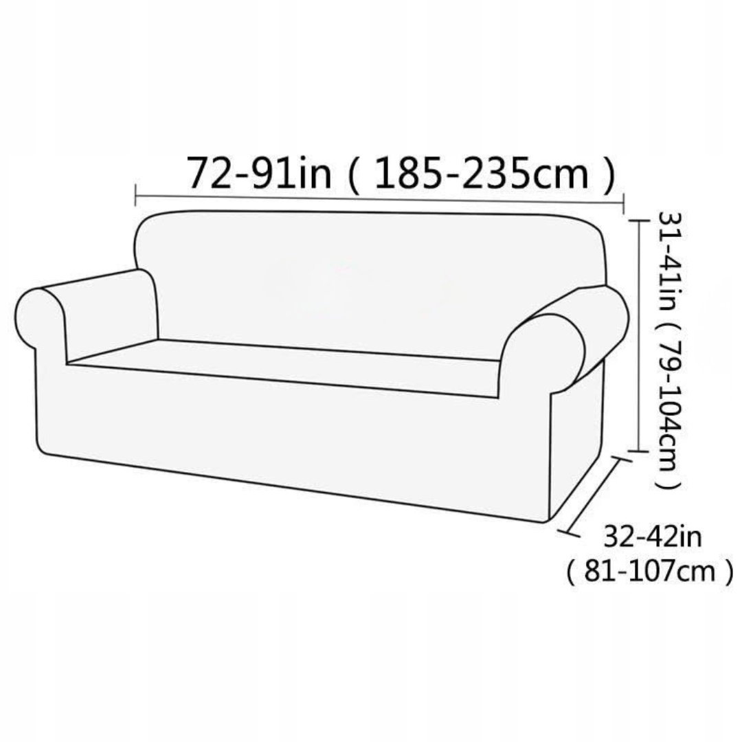 - Rozmiar: 3-osobowa (185–235 cm). Przed zakupem należy zmierzyć długość sofy wraz z podłokietnikami i porównać z tabelą rozmiarów.