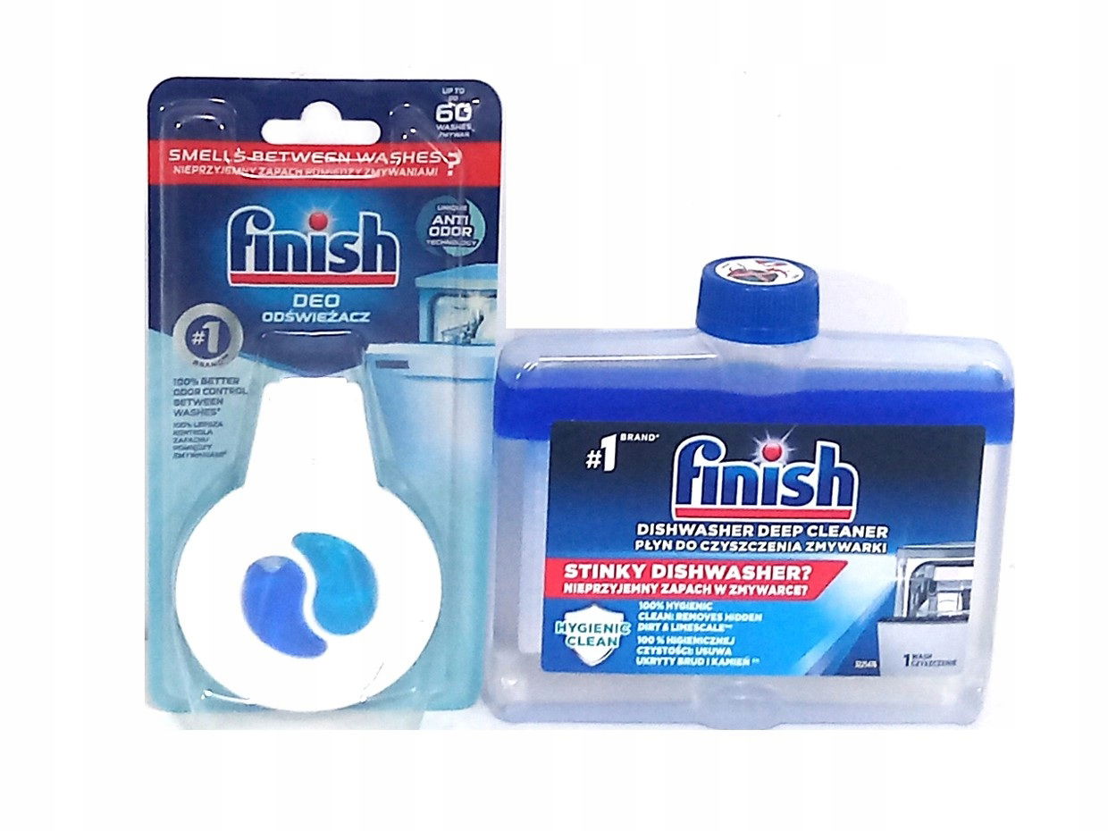 Zestaw do czyszczenia zmywarki marki Finish składający się z dwuwarstwowego płynu czyszczącego oraz odświeżacza (zapachu). Dzięki zastosowaniu dwuwarstwowej formuły płynu czyszczącego usuwa on ukryty brud, kamień oraz sprawia, że zmywarka jest higienicznie czysta. Producent zaleca czyszczenie zmywarki za pomocą ww. produktu raz na 3 miesiące.
