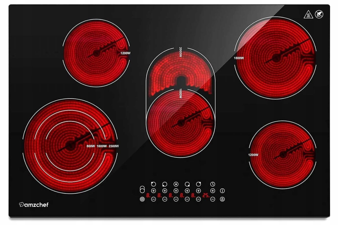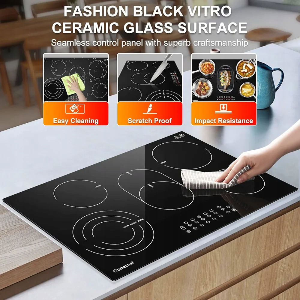 AMZCHEF 5-strefowa płyta grzewcza ze szkła ceramicznego, 77 cm, 9 poziomów mocy, potrójna strefa pieczenia, automatyczne wyłączanie, zamek bezpieczeństwa, funkcja timera, 7295 W