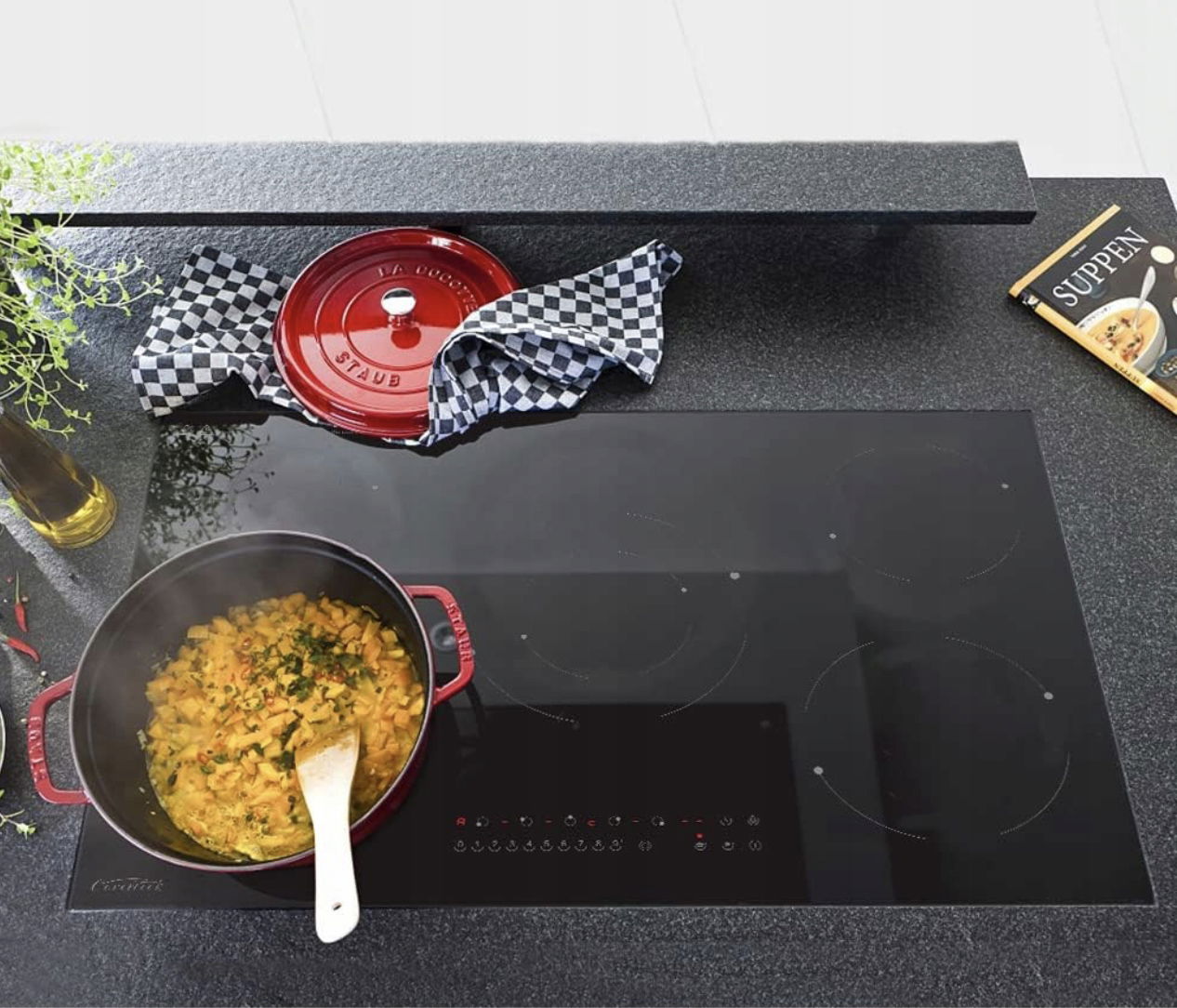 5 stref grzewczych o różnej wielkości, umożliwia jednoczesne przygotowanie różnorodnych potraw, obsługa jednocześnie, oszczędza czas i pieniądze w porównaniu do kuchenek gazowych. Kompatybilny ze wszystkimi rodzajami naczyń kuchennych.