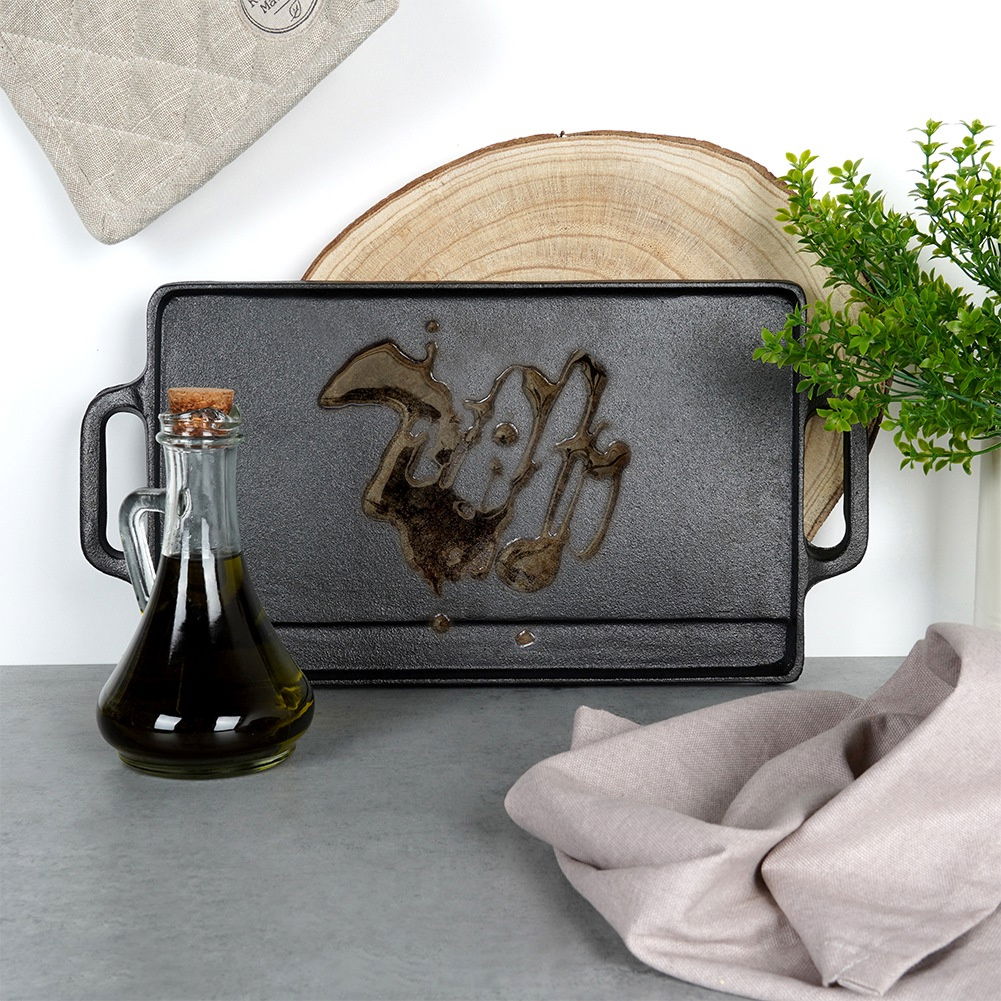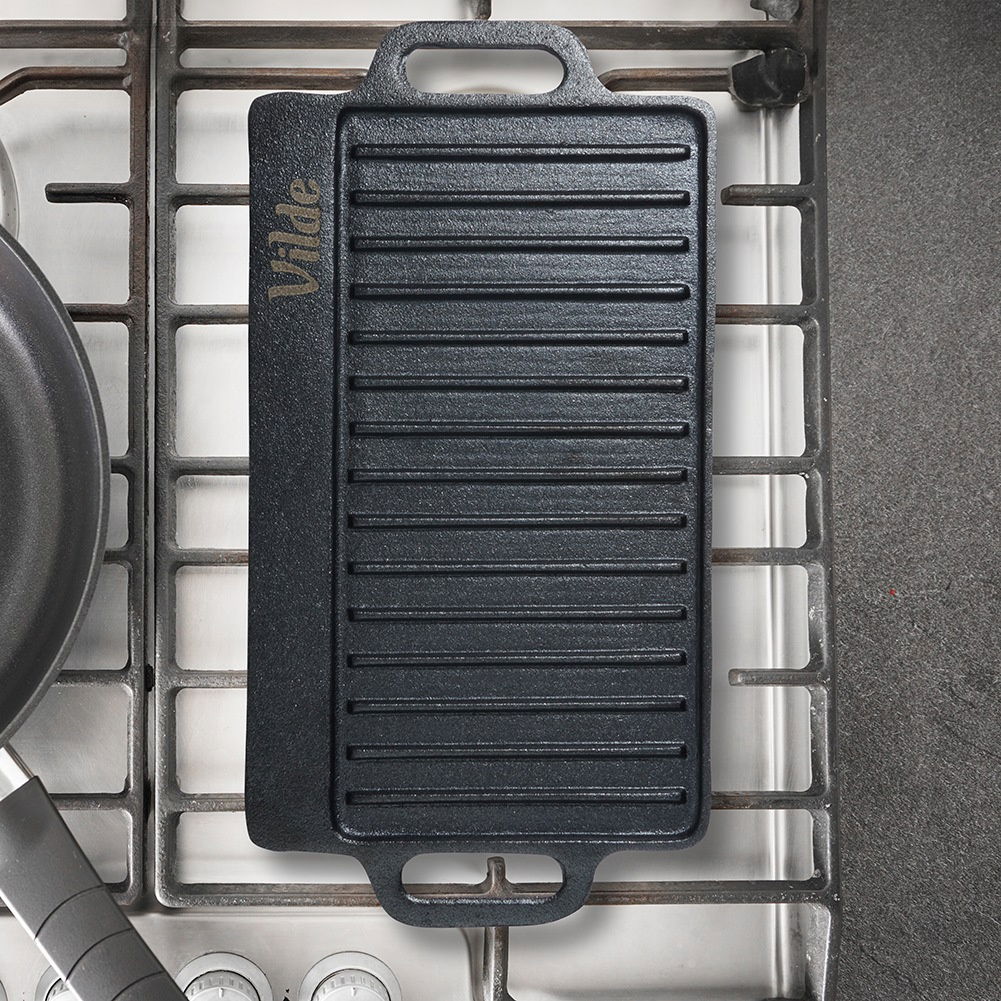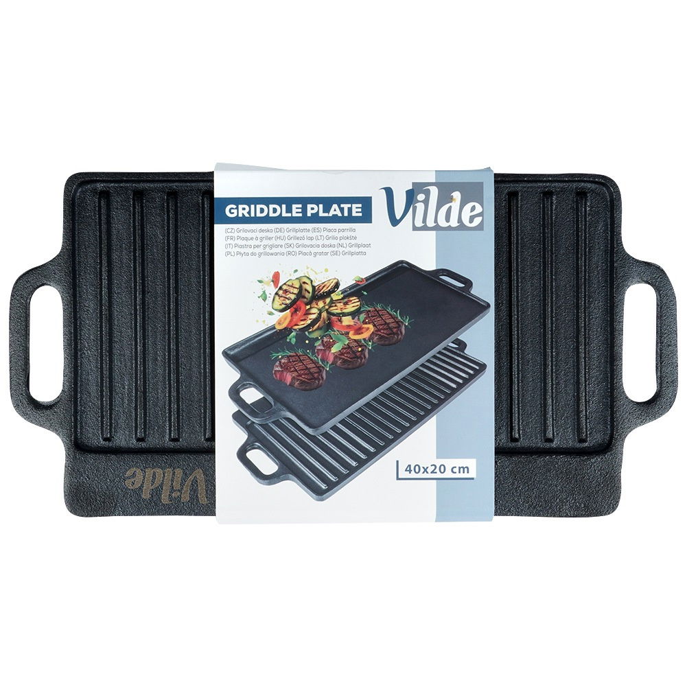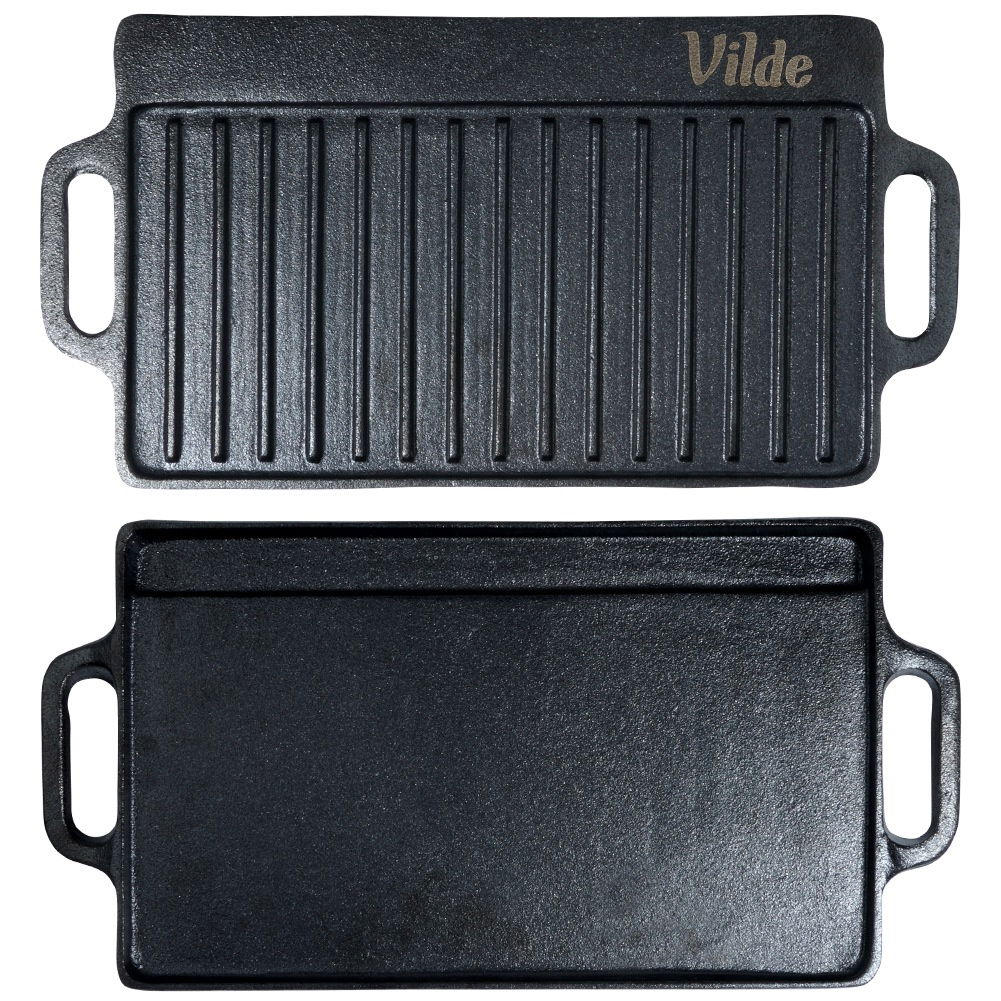 ŻELIWNA - Płyta w całości wykonana z żeliwa, posiada wymiary 40 x 20,5 x 1,5 cm. Wykorzystamy ją do grillowania mięs, ryb i warzyw. Płyta wykonana w całości z odlewu żeliwa. Naczynia wykonane z żeliwa idealnie rozprowadzają ciepło oraz długo utrzymują wysoką temperaturę. DWUSTRONNA - Płyta posiada dwie powierzchnie użytkowe. Z jednej strony powierzchnia jest płaska, z drugiej ma powierzchnię grillową - możemy używać ich w zależności od potrzeby. WSZECHSTRONNA - Płytę można użytkować w piekarniku, na piecu oraz bezpośrednio na ogniu czy grillu. Nadaje się na kuchnie gazowe, elektryczne, ceramiczne a także halogenowe. UNIWERSALNA - Na płycie przygotujemy grillowane mięsa, ryby, warzywa oraz steki. Idealna do grillowania serów oraz kiełbasek. Pozwoli przygotować dania jak i przekąski. Idealnie sprawdzi się do bezpośredniego serwowania przygotowanych potraw. SOLIDNA - Naczynie jest solidne, masywne, długowieczne. Odpowiednio konserwowana - natłuszczana posłuży przez wiele lat. Patelnia odporna na wysokie temperatury. Naczynie idealne do smażenia oraz pieczenia. Nie zaleca się mycia w zmywarce do naczyń. UWAGA! Po każdym użyciu umyć, wytrzeć suchą szmatką do sucha i natłuścić. Dwustronna płyta żeliwna do grillowania mięs, ryb, warzyw. Posiada dwie powierzchnie grillowe przydatne do różnego rodzaju potraw. Płyta jest wytrzymała i odporna. Żeliwo z którego została wykonana jest wysokiej jakości gwarantuje długotrwałą wydajność i odporność na codzienne użytkowanie. Oryginalny produkt marki Vilde z linii Cast Line. Wyprodukowano zgodnie z europejskimi standardami.