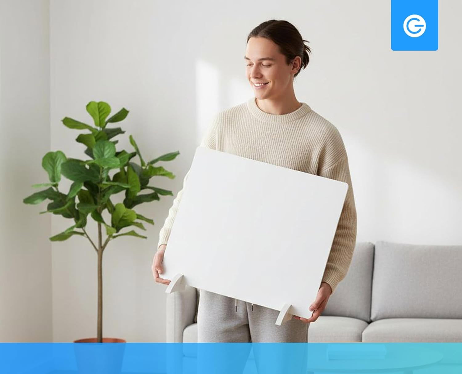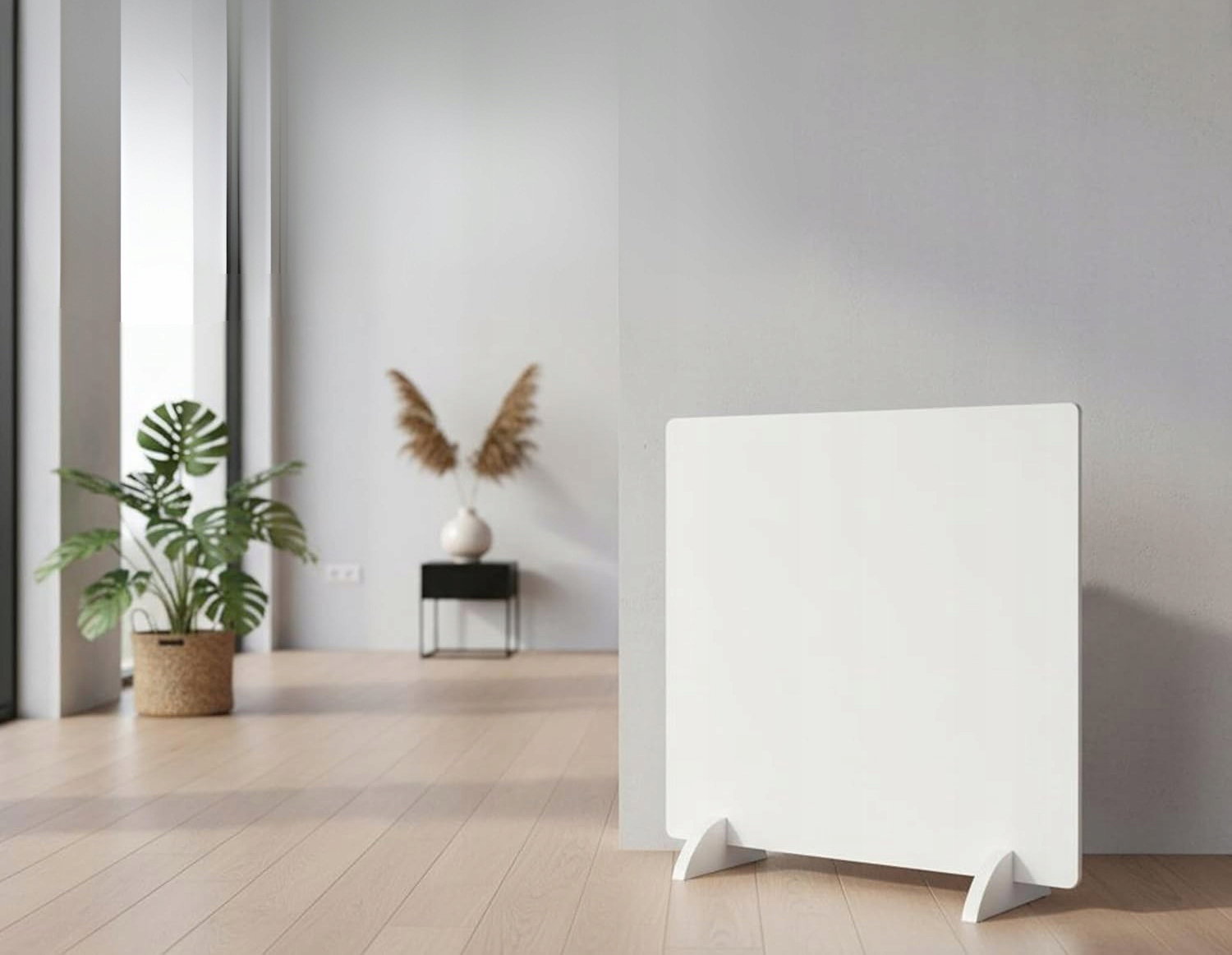 - Mobilność i wygoda użytkowania: lekka konstrukcja oraz montaż podłogowy na nóżkach umożliwiają łatwe przenoszenie panelu pomiędzy pomieszczeniami. Smukły profil sprawia, że urządzenie nie zajmuje dużo miejsca i może być wygodnie przechowywane, gdy nie jest używane.