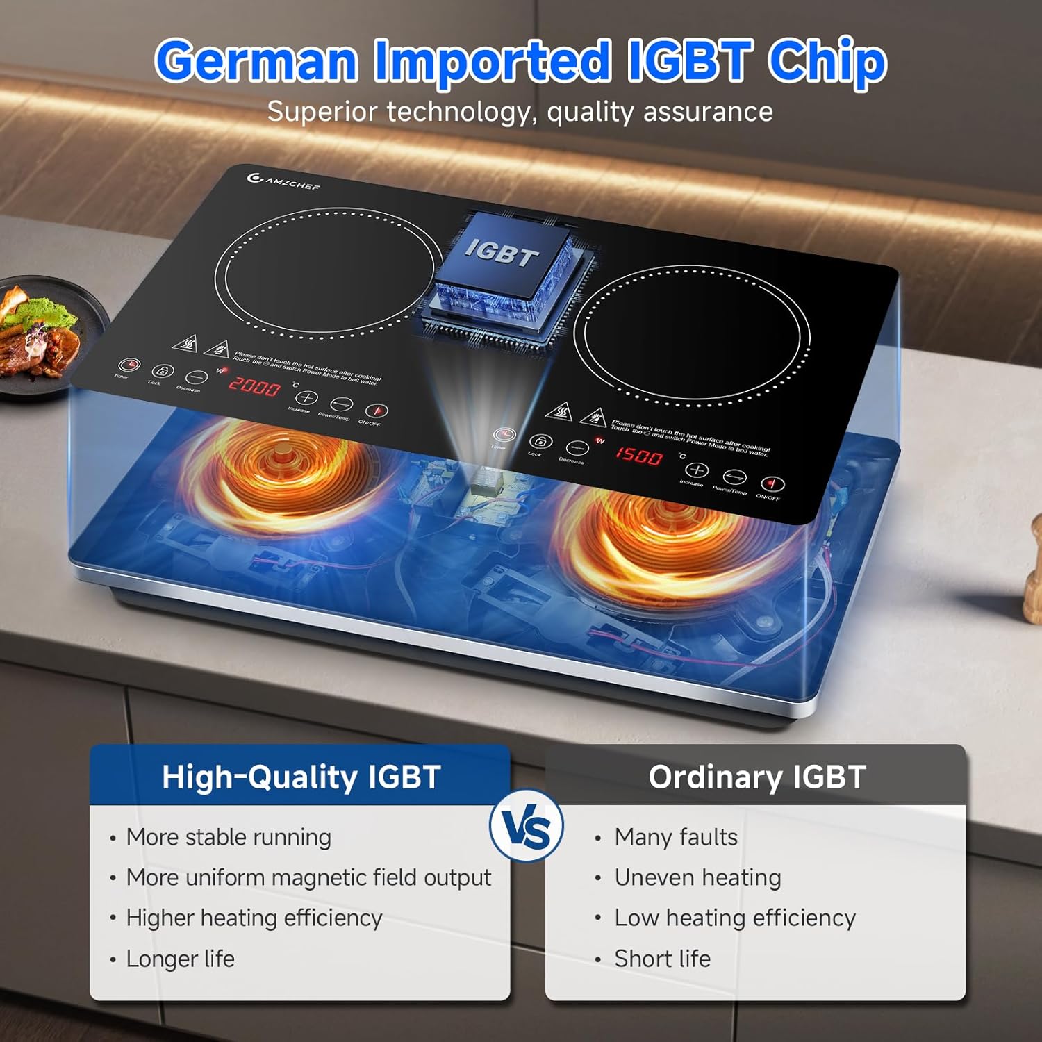 AMZCHEF 2-palnikowa płyta indukcyjna to połączenie wydajności, precyzji i wygody. Niezależne sterowanie i szeroki zakres temperatur pozwalają przygotować różnorodne dania w krótkim czasie, a ulepszony tranzystor IGBT zapewnia bezpieczne i stabilne działanie nawet przy długotrwałym gotowaniu.