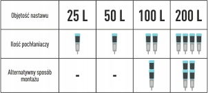 Ilość niezbędnych pochłaniaczy zapachu oraz częstotliwość wymiany węgla w filtrze zależy od objętości nastawu oraz intensywności wydzielających się w trakcie fermentacji gazów. Dla lepszego efektu filtry możemy spiętrować (max 2 szt.) na jednej rurce lub zastosować na oddzielnych rurkach (sugestia użycia w tabeli).