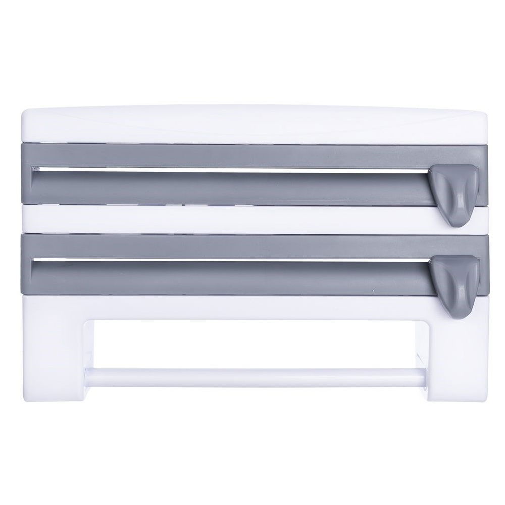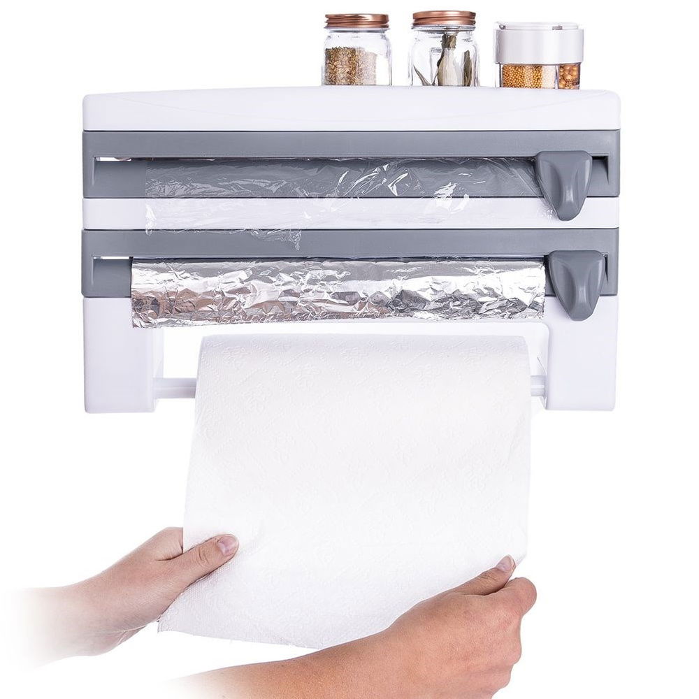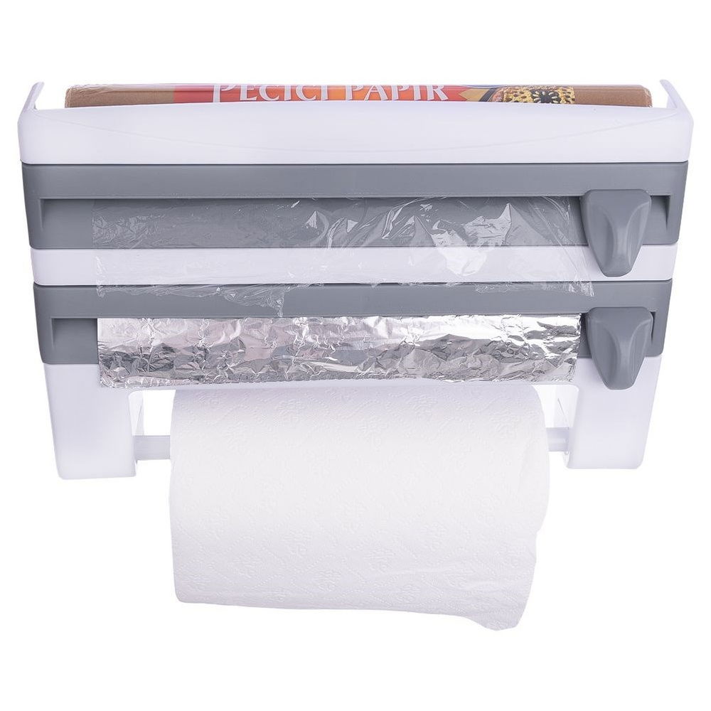 Podajnik do folii i ręczników papierowych do montażu na ścianie. Wygodny w użytkowaniu. Dyspenser pomaga w łatwy sposób wyjmować potrzebną ilość folii spożywczej i folii aluminiowej. Ostrza z uchwytami zapewniają bezpieczne przycinanie potrzebnej ilości folii. Wyposażony w wieszak na ręczniki papierowe. Posiada dodatkową półkę w górnej części, na której można przechowywać papier do pieczenia, małe pojemniki z przyprawami, bądź drobne akcesoria kuchenne (np. minutnik). Przydatny w każdej kuchni, również profesjonalnej.