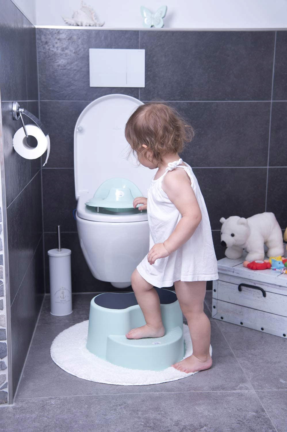 Dzięki antypoślizgowym stopkom, specjalnej strukturze nubbingową na pierwszym stopniu i antypoślizgowej powierzchni, Twoje dziecko stoi wygodnie i pewnie podczas mycia rąk lub pomocy w kuchni. Produkcja z wysokiej jakości materiału, sprawdzonego pod kątem nieszkodliwości chemicznej, gwarantuje również długą trwałość. Po użyciu stołek można łatwo umyć ciepłą wodą z mydłem, a dzięki możliwości zawieszenia można go łatwo i oszczędnie przechowywać w dowolnym miejscu. W połączeniu z deską TOP Rotho Baby design stanowi ona również ważną pomoc w treningu toaletowym i umożliwia dziecku samodzielne chodzenie do toalety.
