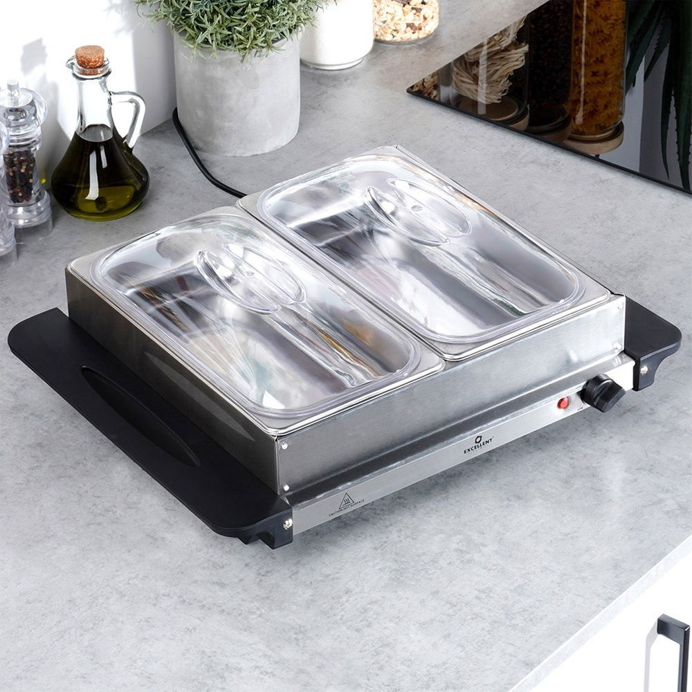 Podgrzewacz bufetowy posiada uniwersalne zastosowanie. Przydatny zarówno w gastronomii, jak i w użytku domowym. Z jego pomocą możemy utrzymywać ciepło serwowanych potraw. Dwa pojemniki pozwolą na podgrzewanie różnych potraw. Uniwersalne zastosowanie sprawdzi się również do podgrzewania talerzy.