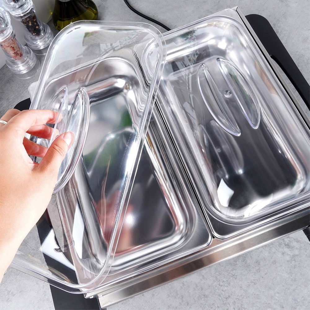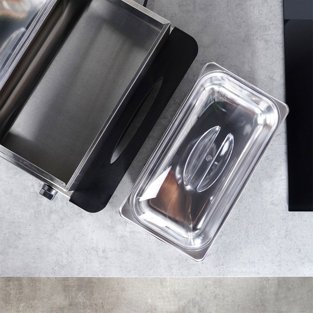 Wykonany ze stali nierdzewnej - Płyta grzewcza, rama oraz wkłady wykonane są ze stali nierdzewnej. Pokrywki do wkładów wykonane są z tworzywa w przezroczystym kolorze. Uchwyty podgrzewacza wykonane z tworzywa w czarnym kolorze. Odpowiednio użytkowany posłuży długie lata.
