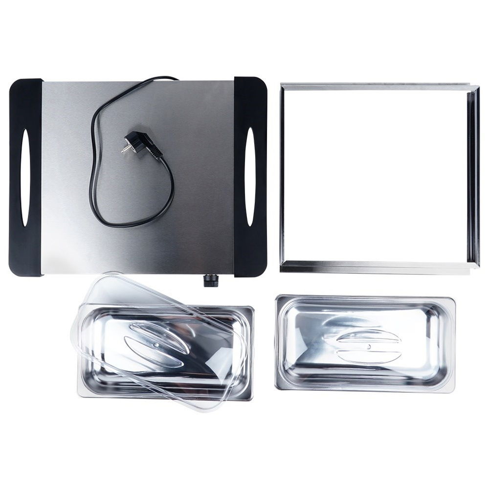 Podgrzewacz elektryczny do potraw o mocy 200W - Podgrzewacz do potraw z płytą grzewczą oraz z dwoma wkładami posiadającymi pokrywy. Wymiar zewnętrzny podgrzewacza z pojemnikami wynosi 47,5 x 39 x 13,5 cm. Wkłady mają wymiar 32,5 x 17,5 x 6 cm oraz pojemność 2,4 l każdy. Płyta grzewcza ma wymiar 35,5 x 34,5 cm.