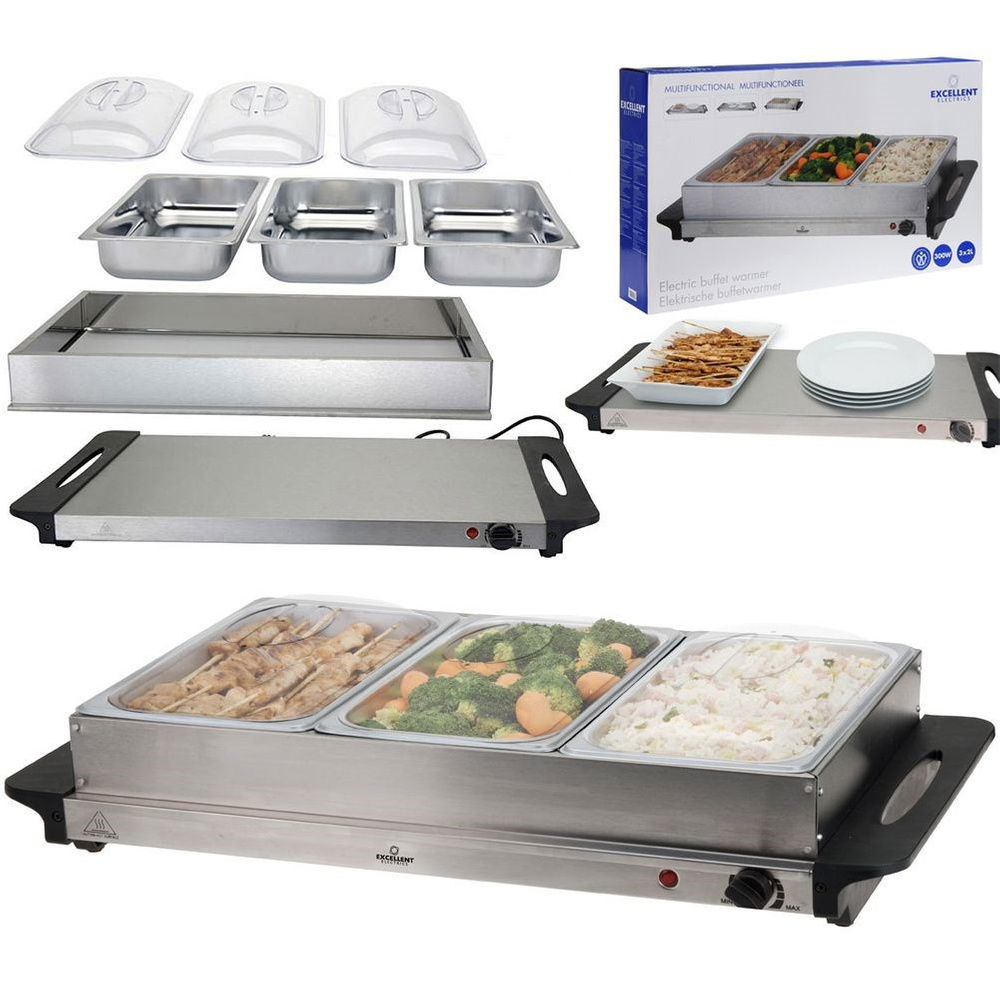 PRAKTYCZNY - Podgrzewacz do potraw z płytą grzewczą 2w1 oraz 3 wkładami posiadającymi pokrywy. Wkłady mają wymiar 32,5 x 17,5 cm oraz pojemność 2 litrów każdy. Wysokość pojemników wynosi 6 cm. Płyta ma wymiary 53 x 36 cm.
