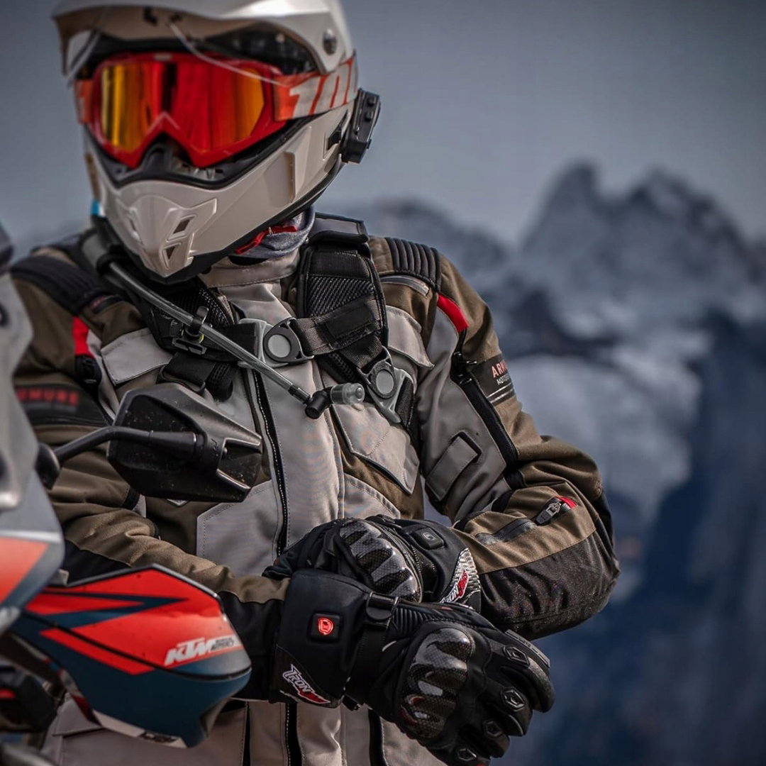 Para podgrzewanych rękawic motocyklowych wyposażonych w akumulator 3000 mAh, zapewniających ciepło i komfort w niskich temperaturach.