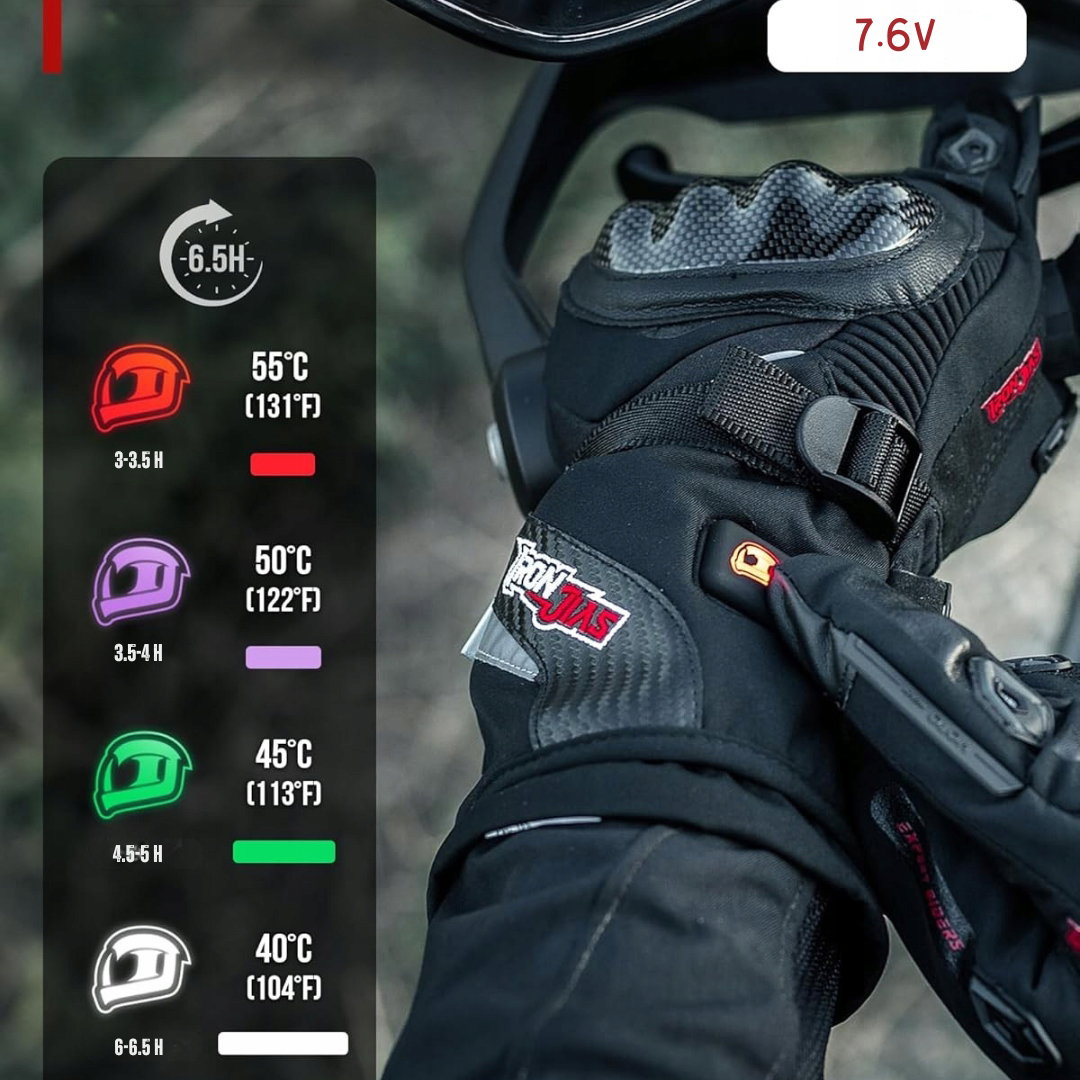 Para podgrzewanych rękawic motocyklowych wyposażonych w akumulator 3000 mAh, zapewniających ciepło i komfort w niskich temperaturach.