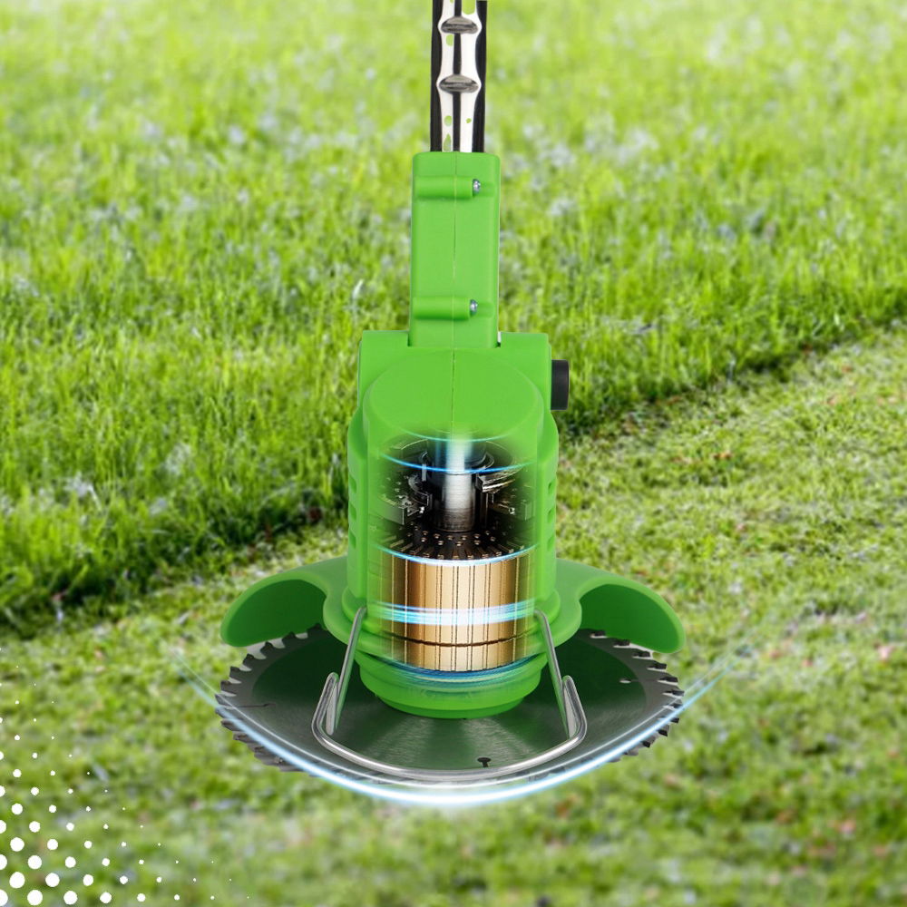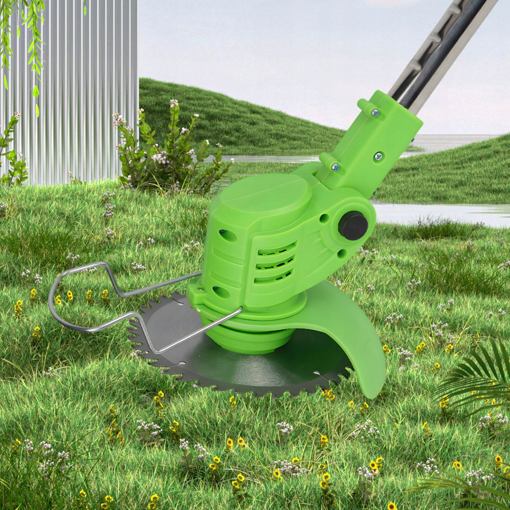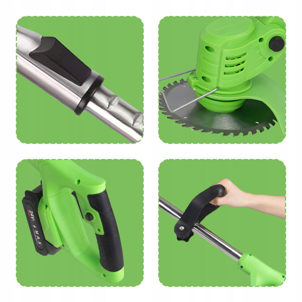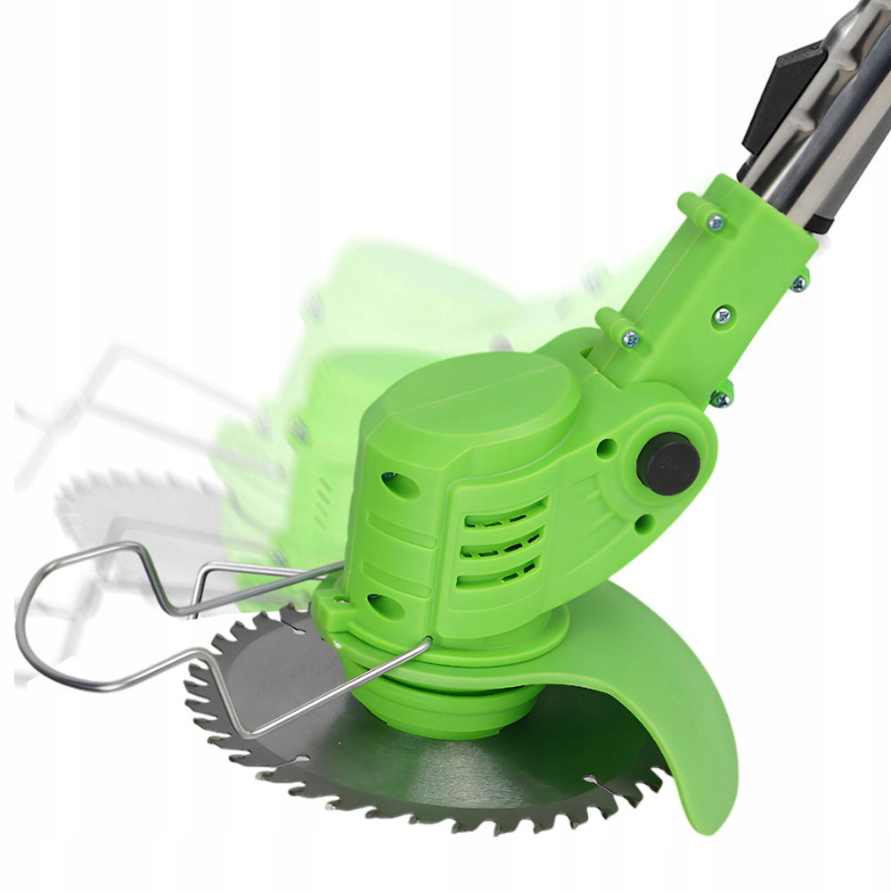Akumulatorowa podkaszarka do trawy jest wyposażona w głowicę tnącą 90°, której można używać bez wysiłku pod różnymi kątami. Akumulatorowa podkaszarka do trawy posiada osłonę ochronną 150°, która skutecznie zapobiega rozpryskiwaniu trawy. Aby uruchomić urządzenie, należy najpierw nacisnąć przełącznik zapobiegający nieprawidłowej obsłudze, a następnie nacisnąć przycisk uruchamiania, aby zapobiec przypadkowemu użyciu i zapewnić bezpieczeństwo.