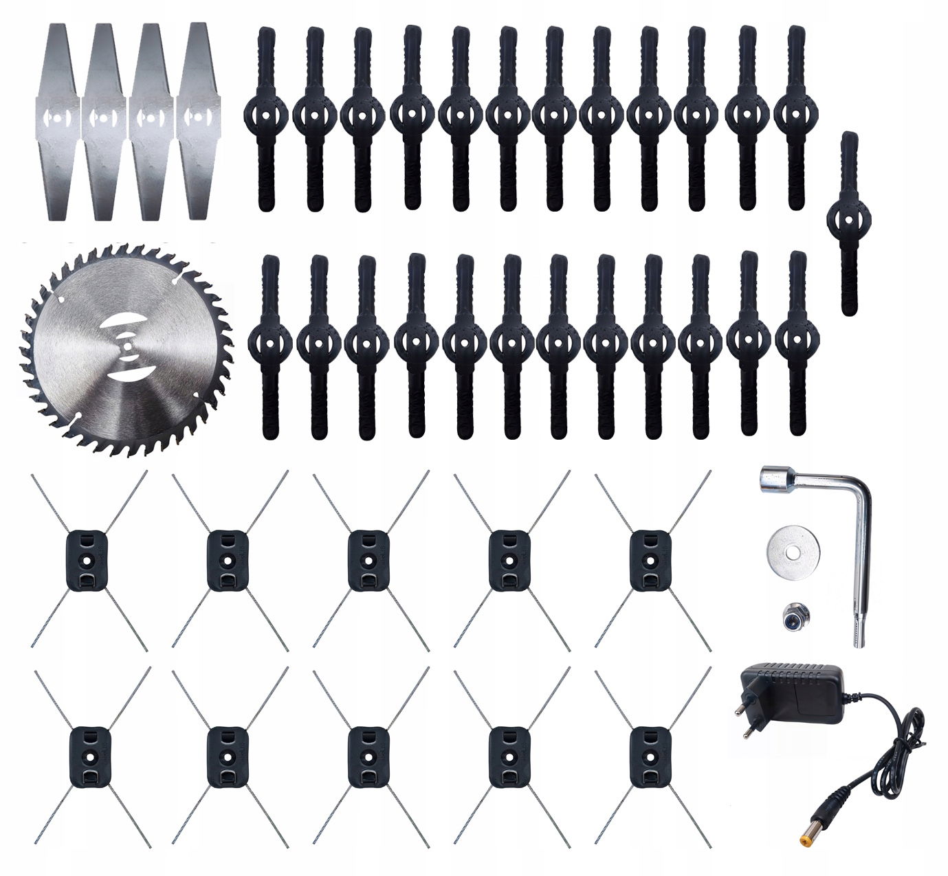 - element tnący: 4X NOŻYKI METALOWE25X NOŻYKI PLASTIKOWE 1X TARCZA WIDIOWA10X ŻYŁKA TNĄCA