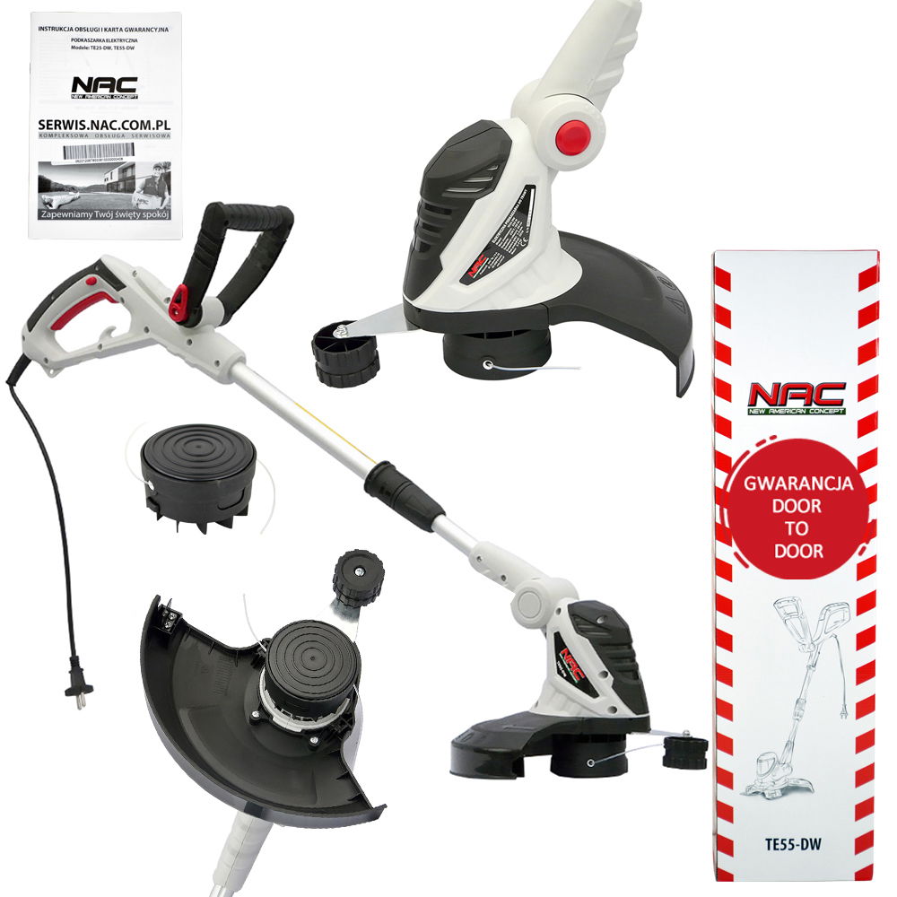 Elektryczna podkaszarka o symbolu TE55-DW to urządzenie produkowane przez znaną i renomowaną firmę NAC. Została wyposażona w elektryczny silnik o mocy 550 W, który uzyskuje prędkość obrotową na poziomie aż 10 000 obr/min.