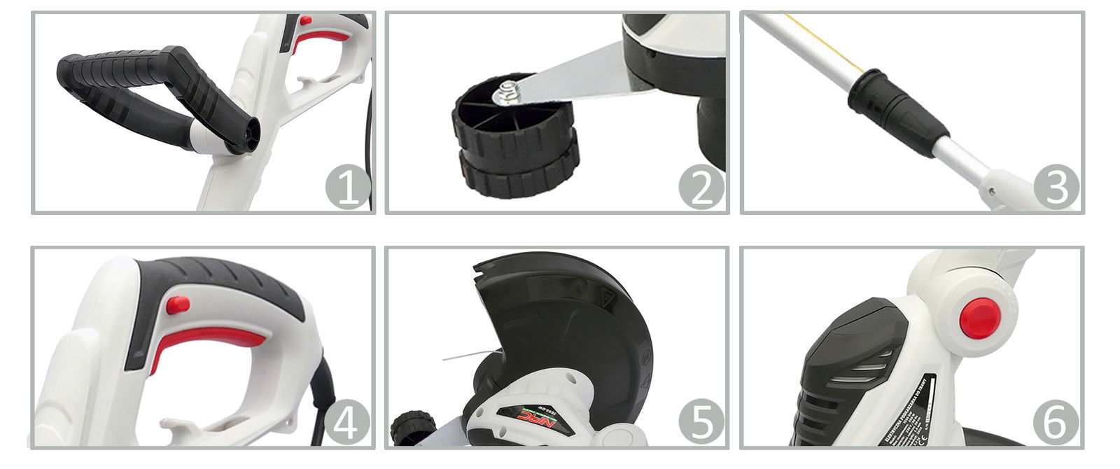 Aby zapewnić użytkownikowi komfort pracy podkaszarką, dolna jej część posiada regulację pochylenia względem rękojeści oraz zamontowano na niej specjalne obrotowe kółko wykorzystywane podczas koszenia trawy przy ogrodzeniach i murkach.