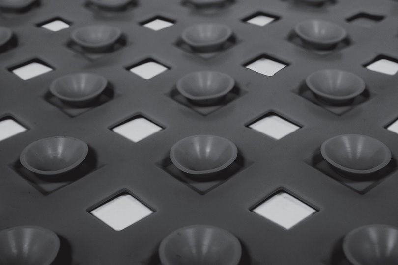 Na spodzie maty umieszczono przyssawki, które mocno przytwierdzają ją do podłoża, sprawiając, że nie przesuwa się nawet na wilgotnych kafelkach. Z maty można korzystać nie tylko przed kabiną prysznicową, ale i w niej - przepuszczalna konstrukcja sprawia, że woda może swobodnie odpływać.