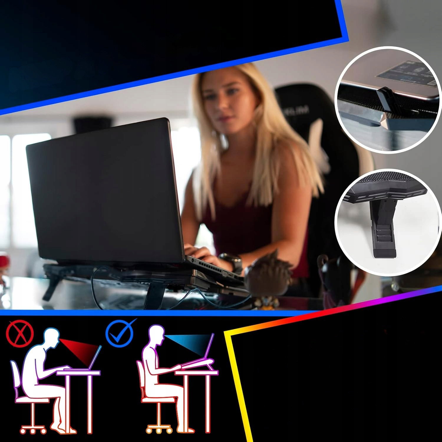 - Ergonomia i stabilność: podstawka posiada tylne nóżki regulujące kąt nachylenia, które poprawiają ergonomię pracy oraz pozycję nadgarstków. Przednie blokady zapobiegają przesuwaniu się laptopa podczas użytkowania. Konstrukcja pomaga utrzymać prawidłową postawę podczas pracy przy komputerze.