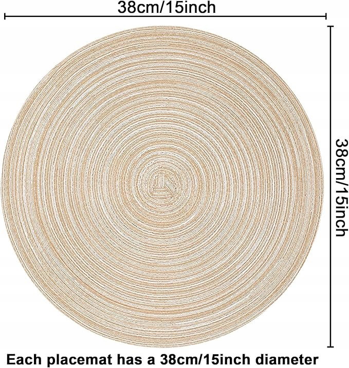 - Zestaw 6 okrągłych podkładek o średnicy 15 cali/38 cm, wystarczająco dużych, aby zmieścił się na nich każdy talerz, kubek i miska.