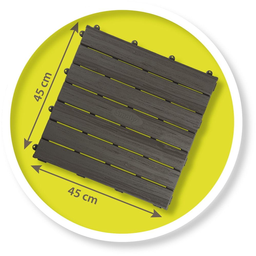Praktyczna podłoga do domków Smoby to zestaw 6 paneli o wymiarach 45 × 45 cm każdy. Dzięki niej podłoże w domku jest stabilne, czyste i wygodne do zabawy. Panele można łatwo złożyć i dopasować do wszystkich modeli domków Smoby, co pozwala stworzyć bezpieczną i komfortową przestrzeń dla dzieci.