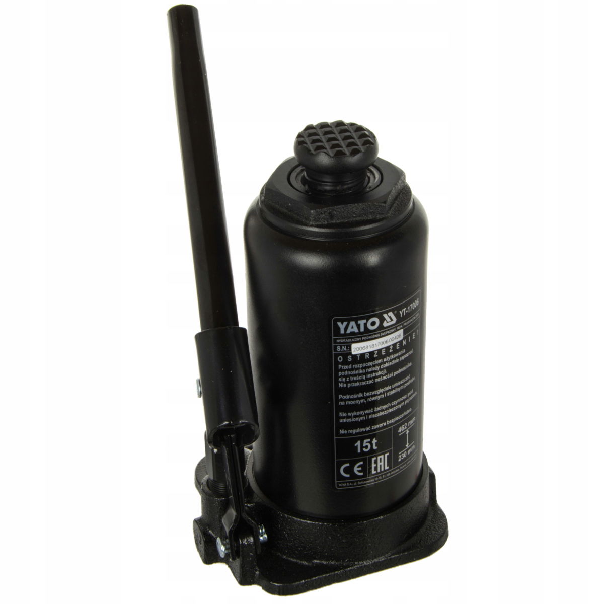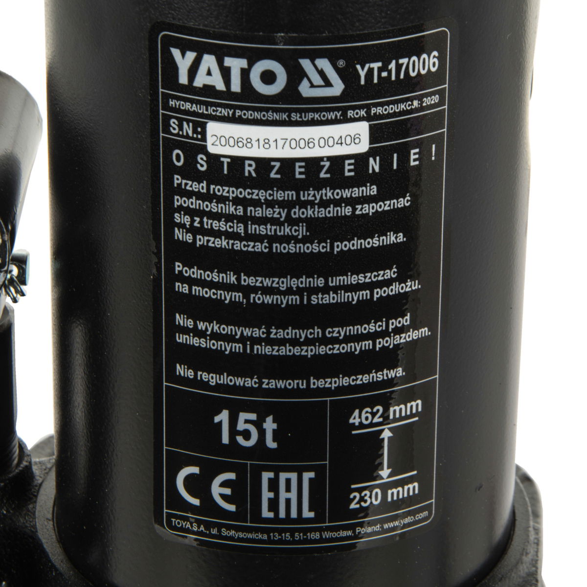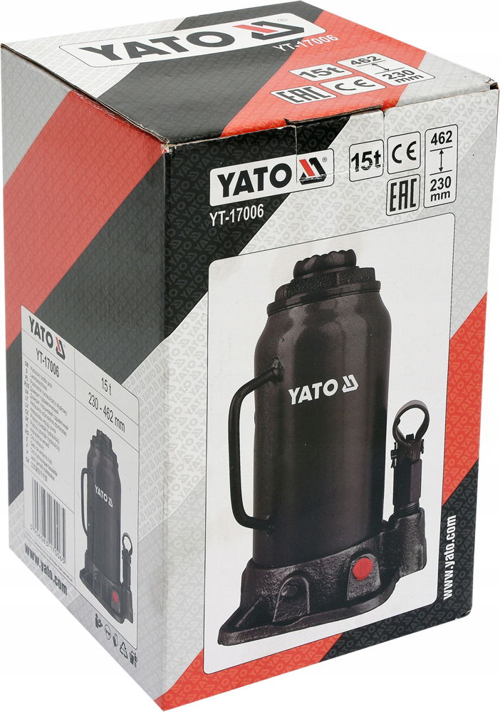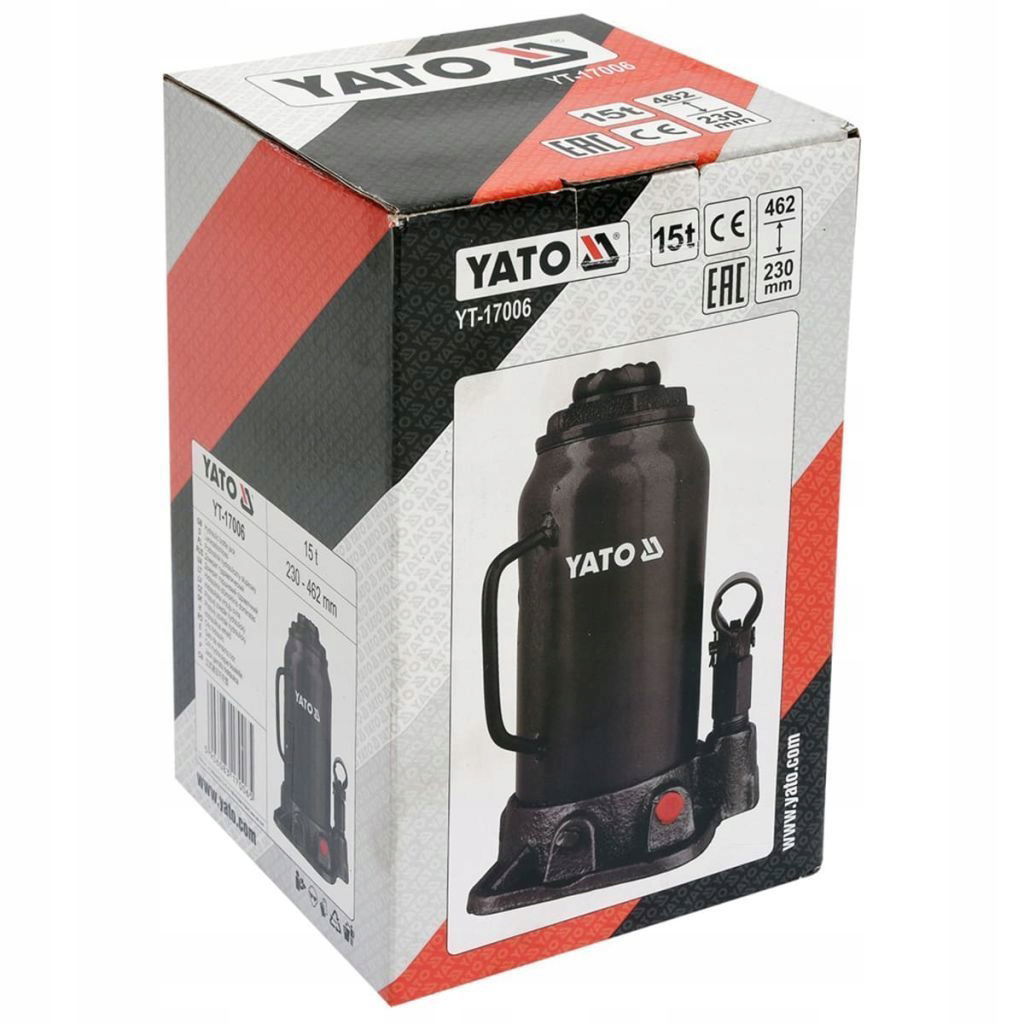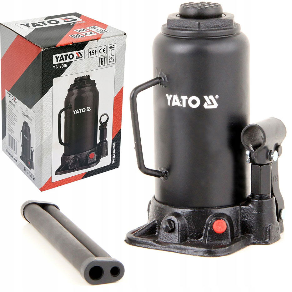 Profesjonalny podnośnik hydrauliczny słupkowy marki YATO, posiadający system zaworów, które precyzyjnie dawkują strugę oleju. Udźwig podnośnika wynosi 15 ton, a zakres podnoszenia wynosi od 230 mm do 462 mm. Charakteryzuje się niewielkim rozmiarem i ciężarem, co ma istotne znaczenie w przemieszczaniu i przechowywaniu. Niezbędny w warsztatach samochodowych i stacjach obsługi pojazdów.
