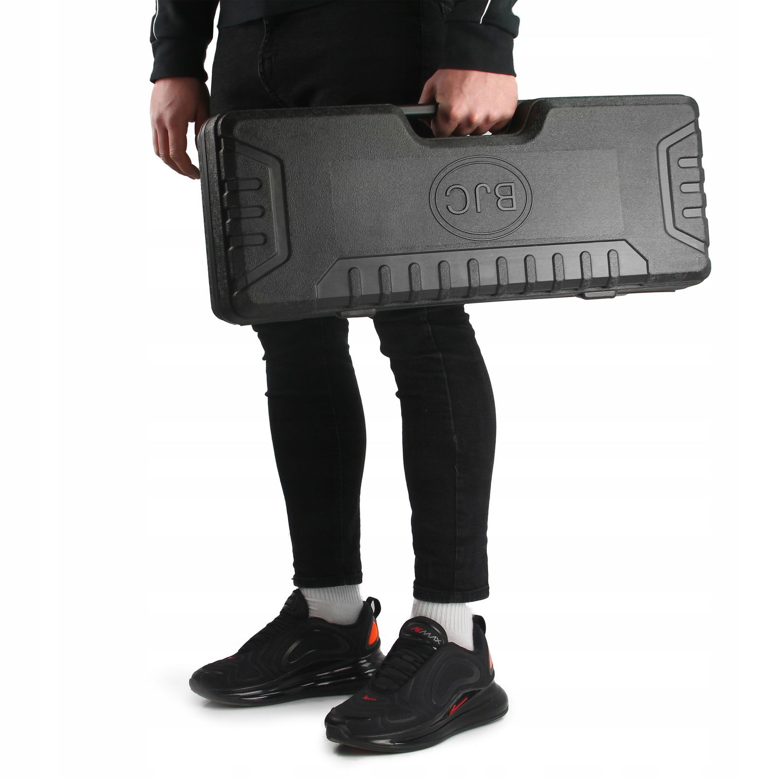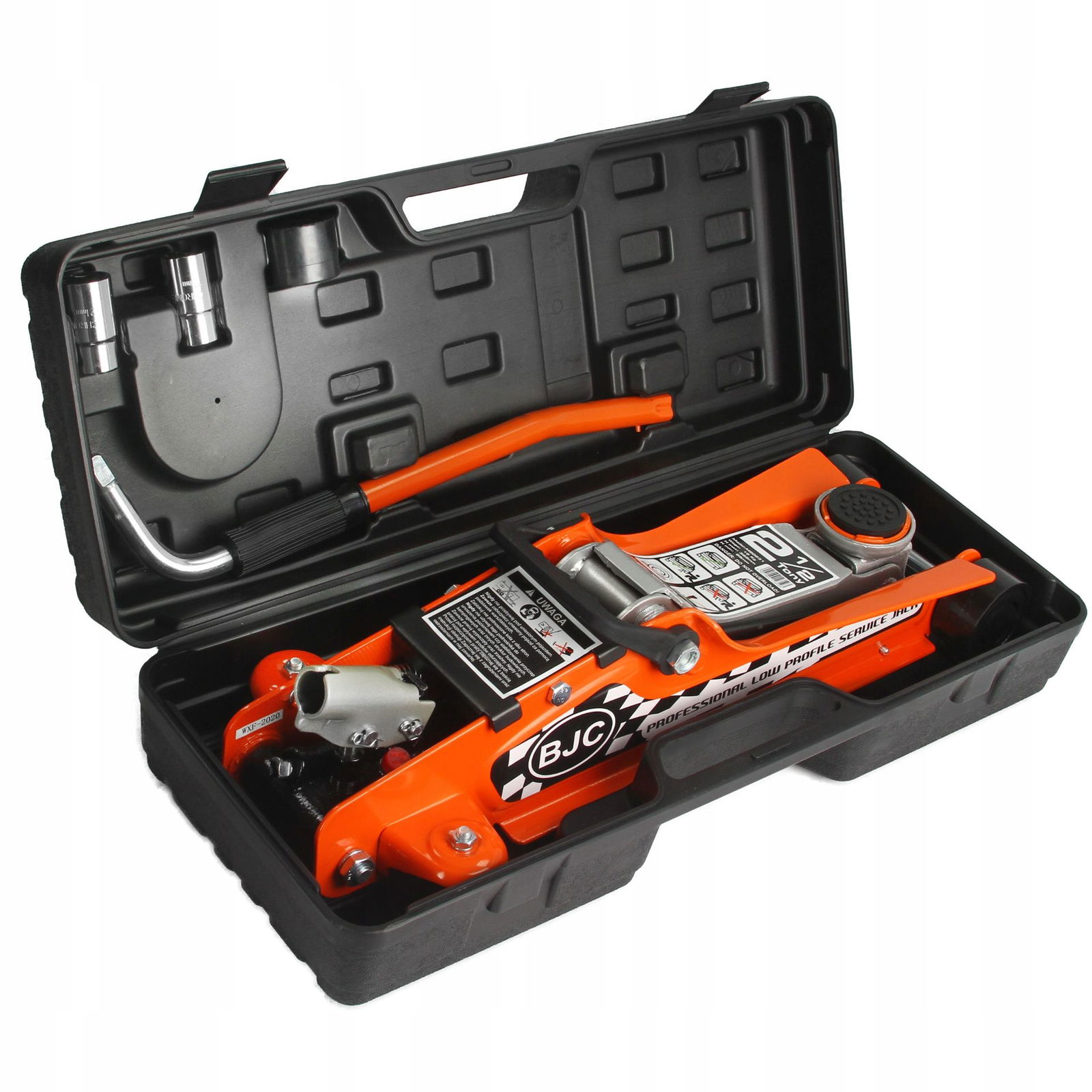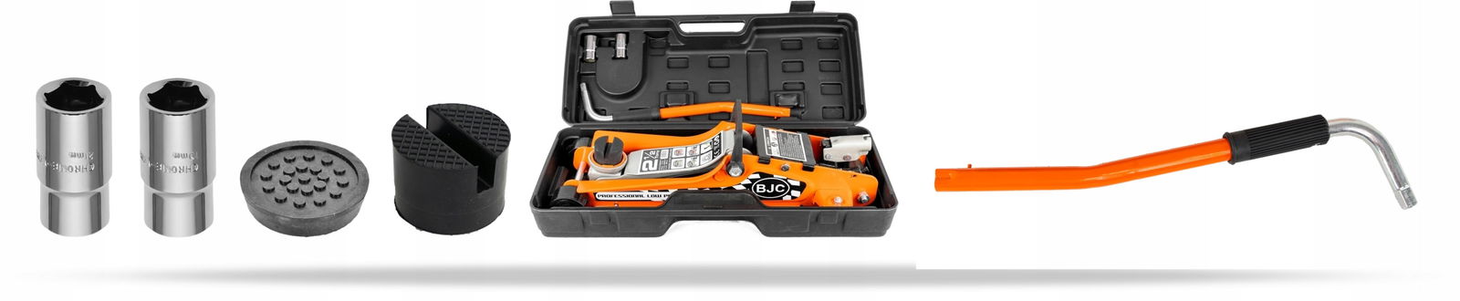 Podnośnik nisko-profilowy w zestawie z walizką, dwoma gumami, rączką dwufunkcyjną oraz nasadkami.