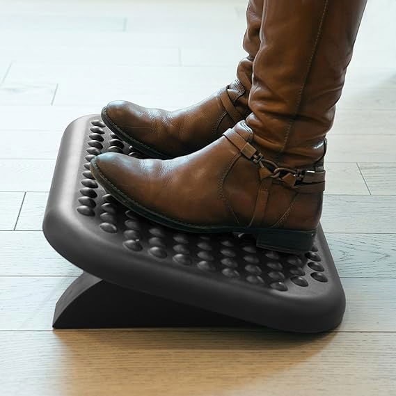 - Regulacja kąta nachylenia — platforma pozwala na delikatne pochylanie, co umożliwia zmianę pozycji nóg w ciągu dnia pracy, zapobiegając sztywności.