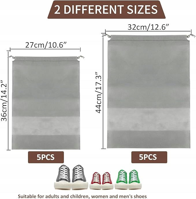 Zestaw w 2 różnych rozmiarach – otrzymasz 10 worków na buty w 2 różnych rozmiarach, duży rozmiar: 44 x 32 cm (5 sztuk), średni rozmiar: 36 x 27 cm (5 sztuk) Różne rozmiary, aby spełnić Twoje wymagania dotyczące przechowywania różnych przedmiotów. 10 sztuk wystarczających, aby zaspokoić codzienne potrzeby, nie za dużo i nie za mało.