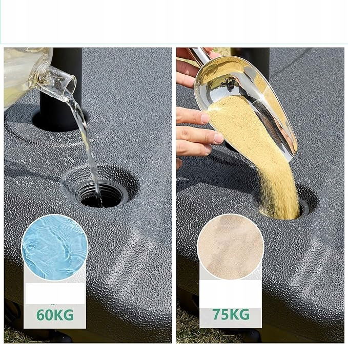 - Wypełnij wodą (60 kg) lub piaskiem (75 kg): Podstawa uchwytu ma zdejmowaną nasadkę do napełniania 60 kg wody. Możesz też wypełnić podstawę parasola piaskiem o wadze 75 kg. Zapewnia wystarczającą wagę, aby parasol był stabilny i bezpieczny przy pomocy stołu lub bez.