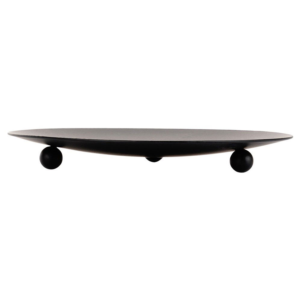 Metalowa podstawka pod świecę. Posiada okrągły kształt i modny, czarny kolor. Wykorzystamy ją również jako podstawkę do tworzenia kompozycji dekoracyjnych. Dzięki niej ochronimy meble przed rozlaniem wosku podczas palenia świecy.