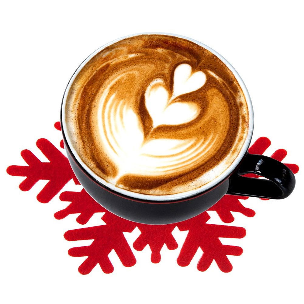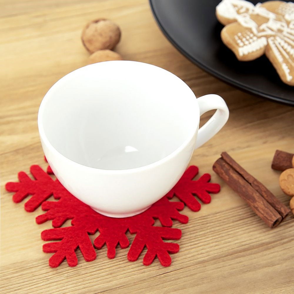 PRZYDATNE - Zestaw sześciu podkładek pod gorące kubki, szklanki oraz filiżanki w kształcie płatków śniegu. Każda podkładka ma wymiary 13,5 x 13 cm. Stanowią wyjątkową dekorację i ozdobę stołu.