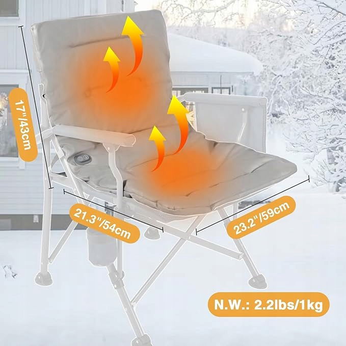 Szerokie zastosowanie: Podgrzewana podkładka na krzesło jest używana ze składanym krzesłem kempingowym podczas wielu zajęć na świeżym powietrzu, takich jak wycieczki, kemping, wycieczki, przyjęcia ogrodowe, wędrówki, pikniki, grille, podwórka, plaże, wędkowanie itp. Skuteczny relaks i łagodzenie stresu w chłodnej porze roku to najlepszy wybór w dążeniu do komfortu.