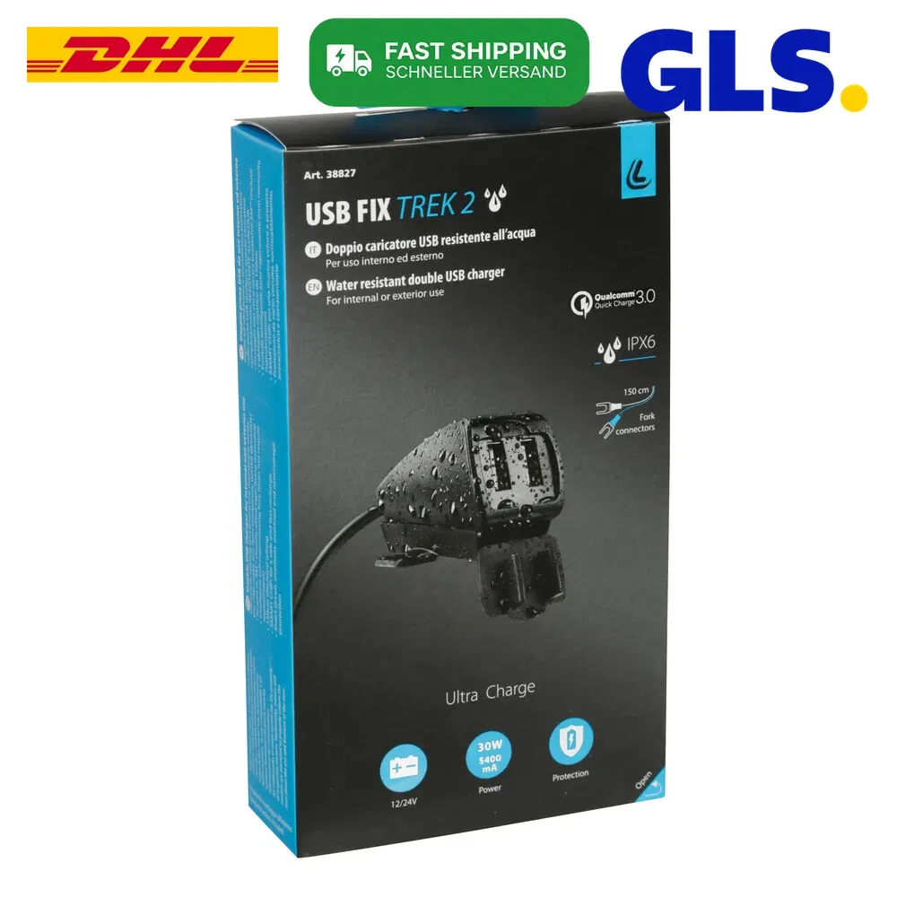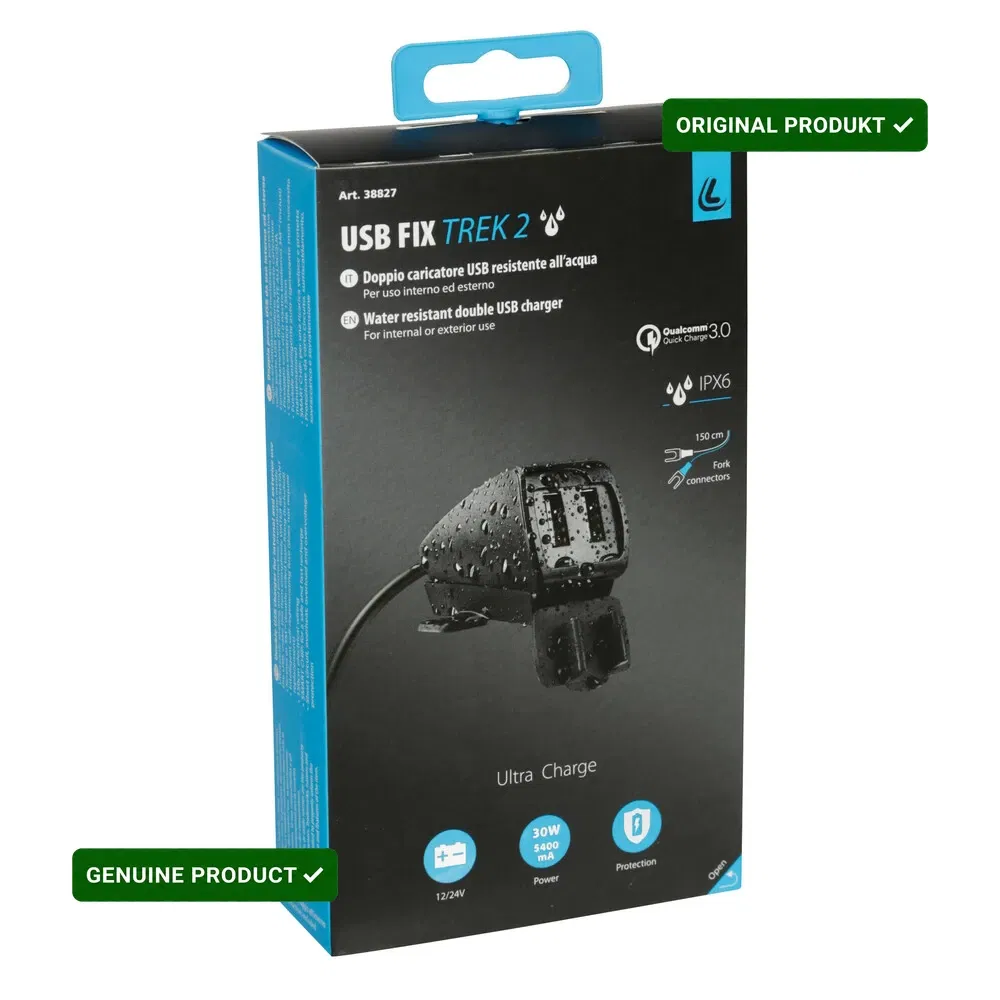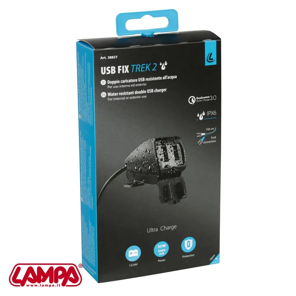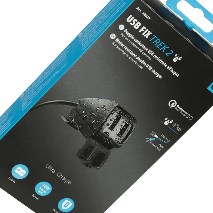 KOD/Nazwa: 38827 Usb-Fix Trek 2, podwójna, wodoodporna ładowarka USB mocowana na śruby lub na taśmie - Ultra Fast Charge - 5400 mA - 12/24 V: