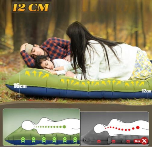 Materac powietrzny Myxslop dla dwóch osób zapewnia wygodne wsparcie dzięki grubości 12 cm, chroni przed zimnem i nierównościami podłoża, umożliwiając komfortowy sen zarówno w pozycji na wznak, jak i na boku.