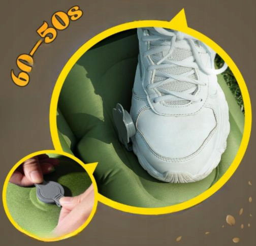 - Szybkie nadmuchiwanie i opróżnianie: materac kempingowy napełnia się całkowicie w 30–60 sekund dzięki wbudowanej pompie nożnej, bez potrzeby użycia pompy ustnej lub ręcznej, a opróżnianie powietrza odbywa się w ciągu sekundy. System podwójnych zaworów oraz wzmocnione szwy z funkcją bezpiecznego uszczelnienia zapewniają trwałe utrzymanie powietrza.